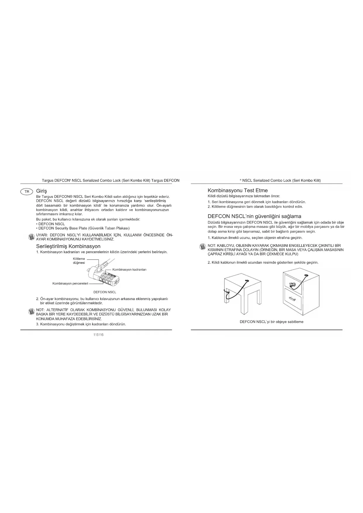 NSCL Serialized Combo Lock (Seri Kombo Kilit) Giriş Bir Targus DEFCON® NSCL Seri Kombo Kilidi satın aldığınız için teşekkür ederiz. DEFCON NSCL değerli dizüstü bilgisayarınızı hırsızlığa karşı ‘serileştirilmiş dört basamaklı bir kombinasyon kilidi’ ile korumanıza yardımcı olur. Ön-ayarlı kombinasyon kilidi, anahtar ihtiyacını ortadan kaldırır ve kombinasyonunuzun sıfırlanmasını imkansız kılar. Bu paket, bu kullanıcı kılavuzuna ek olarak şunları içermektedir: