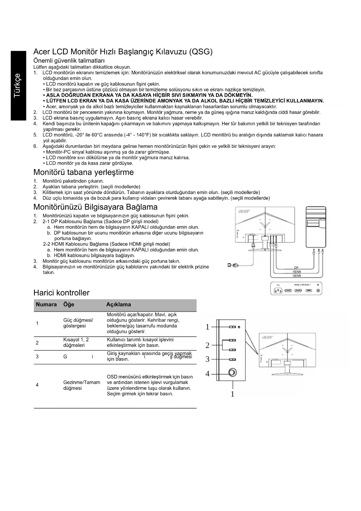 Acer, amonyak ya da alkol bazl temizleyiciler kullanmaktan kaynaklanan hasarlardan sorumlu olmayacaktir.