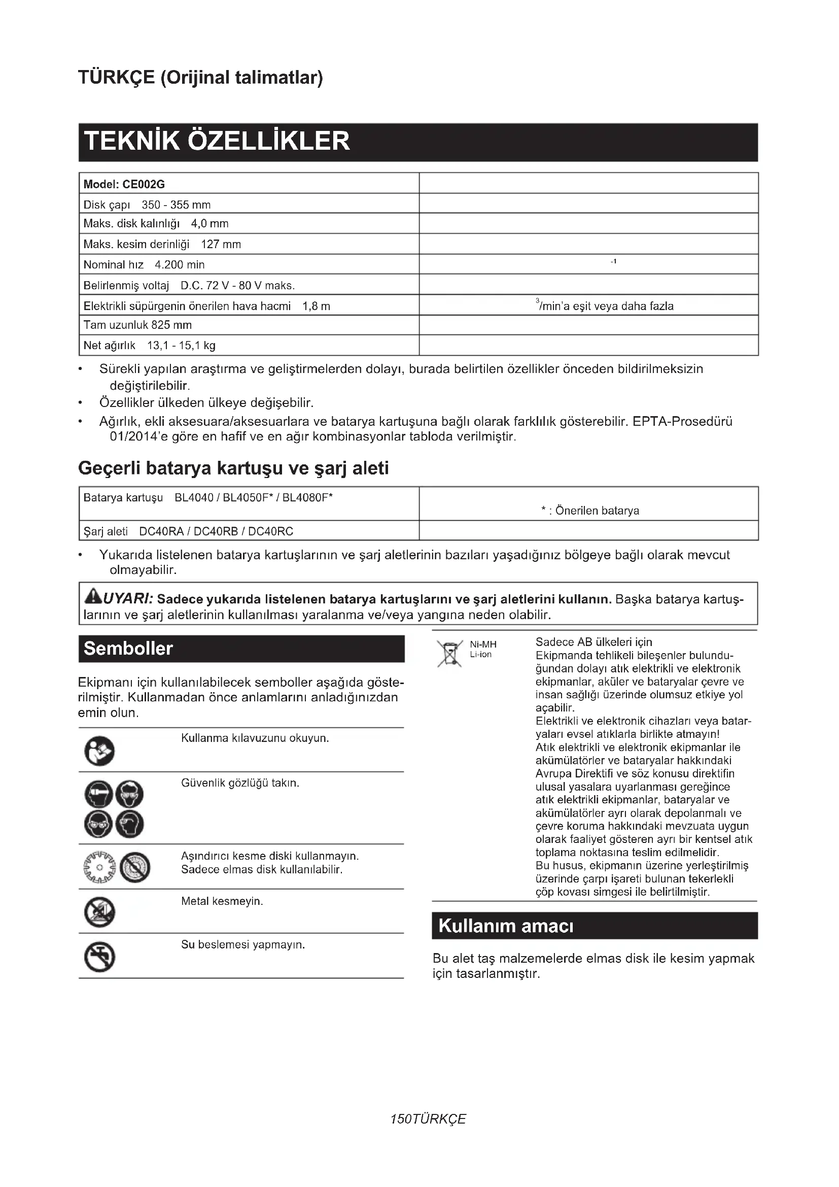 - Yukarıdalistelenenbataryakartuşlarınınveşarjaletlerininbazılarıyaşadığınızbölgeyebağlıolarakmevcut olmayabilir. UYARI: Sadece yukarıda listelenen batarya kartuşlarını ve şarj aletlerini kullanın.Başkabataryakartuş- larınınveşarjaletlerininkullanılmasıyaralanmave/veyayangınanedenolabilir. Semboller Ekipmanıiçinkullanılabileceksembolleraşağıdagöste- rilmiştir.Kullanmadanönceanlamlarınıanladığınızdan eminolun. Kullanmakılavuzunuokuyun. Güvenlikgözlüğütakın. Aşındırıcıkesmediskikullanmayın. Sadeceelmasdiskkullanılabilir. Metalkesmeyin. Subeslemesiyapmayın. Ni-MH Li-ion SadeceABülkeleriiçin Ekipmandatehlikelibileşenlerbulundu- ğundandolayıatıkelektrikliveelektronik ekipmanlar,akülervebataryalarçevreve insansağlığıüzerindeolumsuzetkiyeyol açabilir. Elektrikliveelektronikcihazlarıveyabatar- yalarıevselatıklarlabirlikteatmayın! Atıkelektrikliveelektronikekipmanlarile akümülatörlervebataryalarhakkındaki AvrupaDirektifivesözkonusudirektifin ulusalyasalarauyarlanmasıgereğince atıkelektrikliekipmanlar,bataryalarve akümülatörlerayrıolarakdepolanmalıve çevrekorumahakkındakimevzuatauygun olarakfaaliyetgösterenayrıbirkentselatık toplamanoktasınateslimedilmelidir. Buhusus,ekipmanınüzerineyerleştirilmiş üzerindeçarpıişaretibulunantekerlekli çöpkovasısimgesiilebelirtilmiştir. Kullanım amacı Bualettaşmalzemelerdeelmasdiskilekesimyapmak içintasarlanmıştır.151 TÜRKÇE Gürültü TipikA-ağırlıklıgürültüdüzeyi(EN60745-2-22standardınagörebelirlenen): Sesbasınçseviyesi(L
