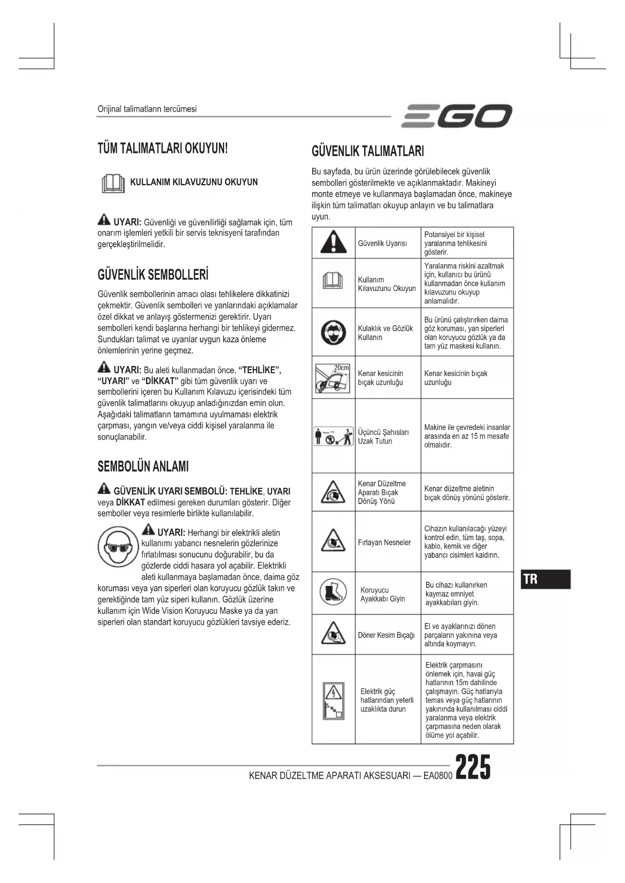 Bu sayfada, bu ürün üzerinde görülebilecek güvenlik sembolleri gösterilmekte ve açıklanmaktadır. Makineyi monte etmeye ve kullanmaya başlamadan önce, makineye ilişkin tüm talimatları okuyup anlayın ve bu talimatlara uyun. Güvenlik UyarısıPotansiyel bir kişisel yaralanma tehlikesini gösterir.Kullanım Kılavuzunu OkuyunYaralanma riskini azaltmak için, kullanıcı bu ürünü kullanmadan önce kullanım kılavuzunu okuyup anlamalıdır.Kulaklık ve Gözlük KullanınBu ürünü çalıştırırken daima göz koruması, yan siperleri olan koruyucu gözlük ya da tam yüz maskesi kullanın. 20cm Kenar kesicinin bıçak uzunluğuKenar kesicinin bıçak uzunluğu 15m Üçüncü Şahısları Uzak TutunMakine ile çevredeki insanlar arasında en az 15 m mesafe olmalıdır.Kenar Düzeltme Aparatı Bıçak Dönüş YönüKenar düzeltme aletinin bıçak dönüş yönünü gösterir.Fırlayan NesnelerCihazın kullanılacağı yüzeyi kontrol edin, tüm taş, sopa, kablo, kemik ve diğer yabancı cisimleri kaldırın.Koruyucu Ayakkabı GiyinBu cihazı kullanırken kaymaz emniyet ayakkabıları giyin.Döner Kesim BıçağıEl ve ayaklarınızı dönen parçaların yakınına veya altında koymayın.Elektrik güç hatlarından yeterli uzaklıkta durunElektrik çarpmasını önlemek için, havai güç hatlarının 15m dahilinde çalışmayın. Güç hatlarıyla temas veya güç hatlarının yakınında kullanılması ciddi yaralanma veya elektrik çarpmasına neden olarak ölüme yol açabilir. Orijinal talimatların tercümesiKENAR DÜZELTME APARATI AKSESUARI — EA0800226