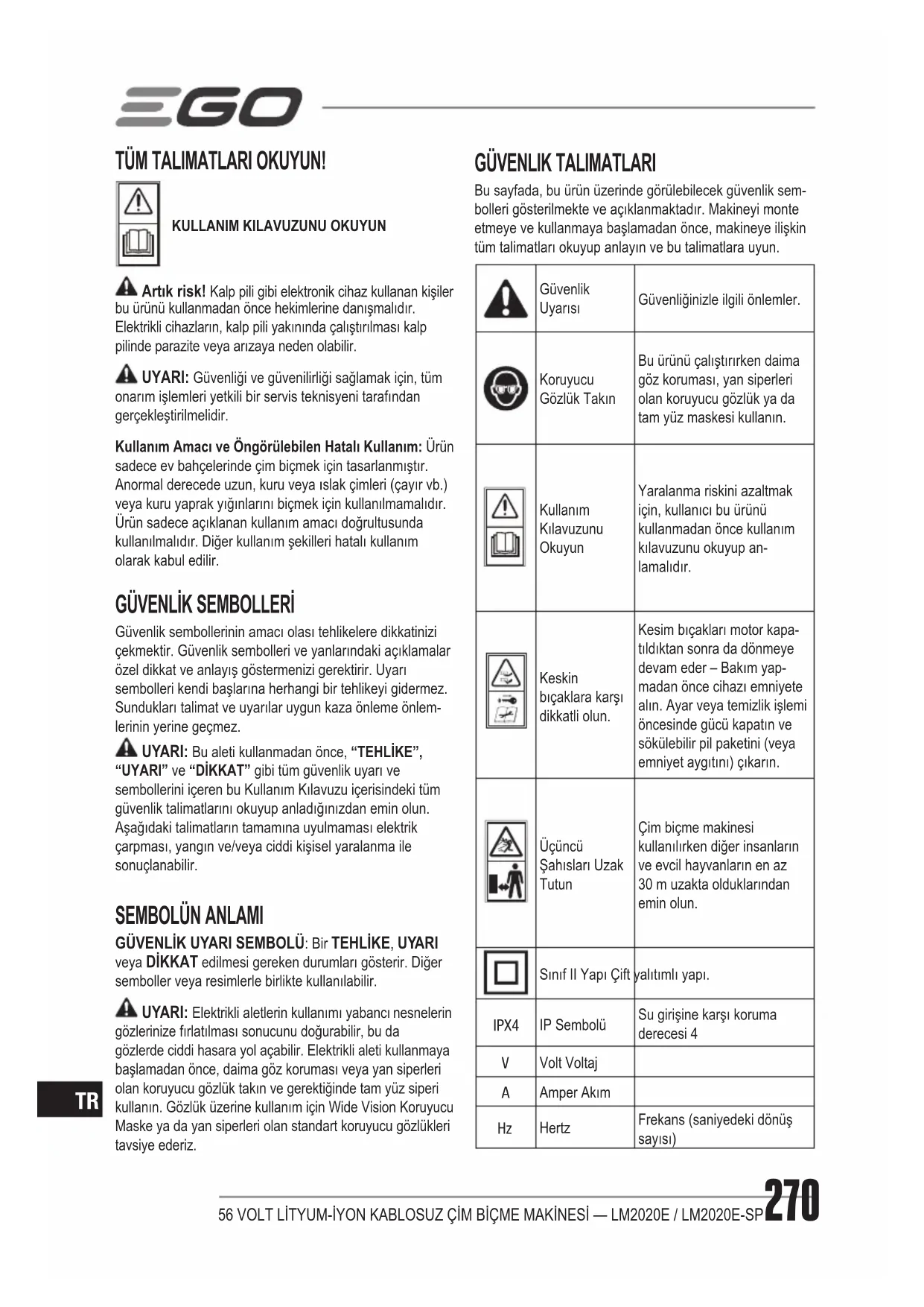 TEHLİKE: Bu makine, bu kılavuzda yer alan güvenli çalıştırma kurallarına uygun olarak çalıştırılmak üzere tasarlanmıştır. Tüm elektrikli cihazlarda olduğu gibi, operatörün dikkatsizliği veya herhangi bir hatası ciddi yaralanmaya yol açabilir. Bu makine ellerinizi ve ayaklarınızı yaralayabilir ve nesneleri fırlatıp atabilir. Tüm güvenlik talimatlarına uyulmaması ciddi yaralanmalara veya ölüme yol açabilir. UYARI: Kablosuz çim biçme makinesini kullanırken yangın, elektrik çarpması ve kişisel yaralanma riskini azaltmak için daima temel güvenlik önlemleri alınmalıdır.ÖNEMLİ KULLANMADAN ÖNCE DİKKATLE OKUYUN. GELECE-KTE BAŞVURU AMACIYLA SAKLAYIN. KABLOSUZ ÇİM BİÇME MAKİNELERİ İÇİN GÜVENLİK KURALLARI:DIKKAT-DÖNER BIÇAĞA DOKUNMAYIN!EĞITIM ◾ Talimatları dikkatle okuyun. Cihazın kumandalarını ve uygun kullanım şeklini öğrenin. ◾ Çocukların veya kullanma talimatları hakkında yeterli bilgiye sahip olmayan kişilerin makineyi kullanmasına asla izin vermeyin. Yerel yönetmelikler kullanıcı yaşına sınırlama getirebilir. ◾ Yakınınızda başkaları, özellikle de çocuklar veya evcil hayvanlar varken asla çim biçmeyin. ◾ Operatör veya kullanıcı, diğer kişilerin ya da diğer kişilere ait eşyaların başına gelebilecek yaralanma veya hasarlardan sorumludur. HAZIRLIK ◾ Cihazı kullanırken, daima sağlam bir ayakkabı ve uzun pantolon giyin. ◾ Makineyi çıplak ayakla veya açık sandaletler giyerek kullanmayın. Bol veya sarkan ipleri veya bağcıkları bulunan giysiler giymekten kaçının. ◾ Makinenin kullanılacağı alanı kontrol edin, tüm taş, sopa, kablo, kemik ve diğer yabancı cisimleri kaldırın. ◾ Kullanmadan önce bıçakların, bıçak cıvatalarının ve kesme modüllerinin aşınıp aşınmadıklarını veya hasar görüp görmediklerini görsel olarak kontrol edin. Dengeyi korumak için, aşınmış veya hasar görmüş bıçaklarla bıçak cıvatalarını set olarak değiştirin. Hasar görmüş veya okunmayan etiketleri değiştirin. ÇALIŞTIRMA ◾ Sadece gün ışığında veya iyi aydınlatılmış yerlerde biçme yapın. ◾ Makineyi mümkün olduğu kadar ıslak çim üzerinde kullanmaktan kaçının. ◾ Eğimli alanlarda bastığınız yerlerin sağlam olduğundan emin olun. ◾ Yürüyün, asla koşmayın. ◾ Tekerlekli dönerek çalışan çim biçme makineleri ile çalışırken; eğimli yüzeyin enine doğru çim biçin, asla yukarı aşağı yönde biçmeyin; ◾ Eğimli yerlerde yön değiştirirken son derece dikkatli olun. ◾ Çok dik eğimli yerlerde çim biçmeyin. ◾ Geriye giderken veya makineyi kendinize doğru çekerken çok dikkatli olun. ◾ Makineyi çim olmayan bir alandan geçirmek için yatırıp çekerken ve çim biçilecek alana getirip götürürken bıçağı/bıçakları durdurun. ◾ Makineyi asla hasarlı koruyucu donanım veya güvenlik parçaları ile veya deektör, çim toplama haznesi vb. güvenlik cihazları takılı olmadan kullanmayın. ◾ Motoru talimatlara uygun biçimde ve ayaklar bıçaktan/ bıçaklardan yeteri kadar uzak olduğu halde çalıştırın. ◾ Çalışması için yana yatırılması gereken durumlar hariç, motoru çalıştırırken makineyi yana yatırmayın. Ürünün yana yatırılması gerekirse, yatırma işlemini sadece gerektiği kadar ve operatöre uzak olan tarafından yapın. Makineyi tekrar zemin üzerine yerleştirmeden önce her iki elinizin de çalıştırma konumunda olduğundan emin olun. ◾ Boşaltma ağzının önünde dururken makineyi çalıştırmayın. ◾ Ellerinizi veya ayaklarınızı hareketli parçaların yakınına veya altına yerleştirmeyin. Döner tip biçicilerde, boşaltma ağzından daima uzak durun. ◾ Motor çalışır durumda iken makineyi asla havaya kaldırmayın veya taşımayın.56 VOLT LİTYUM-İYON KABLOSUZ ÇİM BİÇME MAKİNESİ — LM2020E / LM2020E-SP272