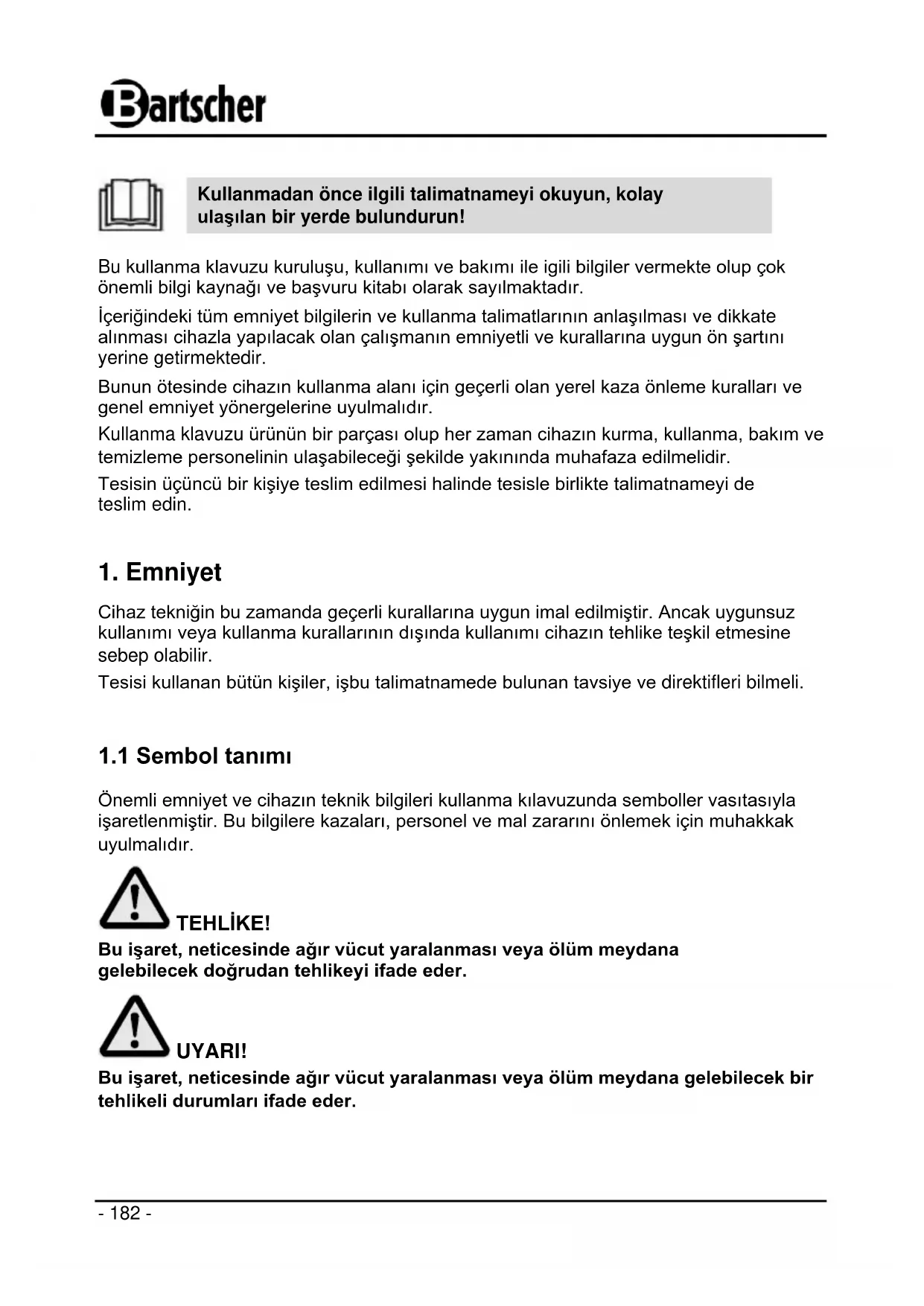 Önemli emniyet ve cihazın teknik bilgileri kullanma kılavuzunda semboller vasıtasıyla işaretlenmiştir. Bu bilgilere kazaları, personel ve mal zararını önlemek için muhakkak uyulmalıdır. TEHLİKE! Bu işaret, neticesinde ağır vücut yaralanması veya ölüm meydana gelebilecek doğrudan tehlikeyi ifade eder. UYARI! Bu işaret, neticesinde ağır vücut yaralanması veya ölüm meydana gelebilecek bir tehlikeli durumları ifade eder.- 183 -