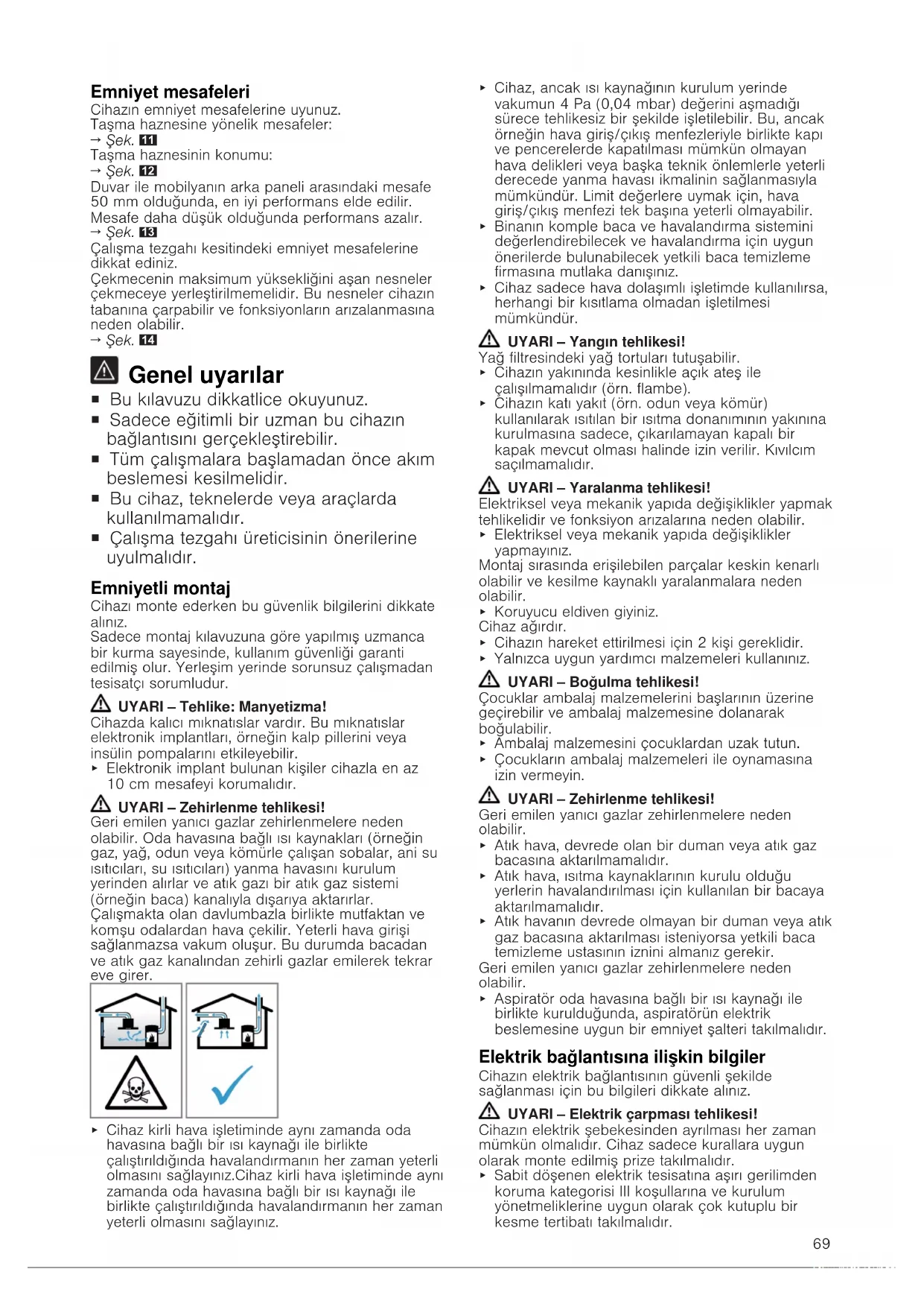 Genel uyarılar ¡ Bu kılavuzu dikkatlice okuyunuz. ¡ Sadece eğitimli bir uzman bu cihazın bağlantısını gerçekleştirebilir. ¡ Tüm çalışmalara başlamadan önce akım beslemesi kesilmelidir. ¡ Bu cihaz, teknelerde veya araçlarda kullanılmamalıdır. ¡ Çalışma tezgahı üreticisinin önerilerine uyulmalıdır. Emniyetli montaj Cihazı monte ederken bu güvenlik bilgilerini dikkate alınız. Sadece montaj kılavuzuna göre yapılmış uzmanca bir kurma sayesinde, kullanım güvenliği garanti edilmiş olur. Yerleşim yerinde sorunsuz çalışmadan tesisatçı sorumludur. UYARI‒Tehlike: Manyetizma! Cihazda kalıcı mıknatıslar vardır. Bu mıknatıslar elektronik implantları, örneğin kalp pillerini veya insülin pompalarını etkileyebilir. ▶ Elektronik implant bulunan kişiler cihazla en az 10cm mesafeyi korumalıdır. UYARI‒Zehirlenme tehlikesi! Geri emilen yanıcı gazlar zehirlenmelere neden olabilir. Oda havasına bağlı ısı kaynakları (örneğin gaz, yağ, odun veya kömürle çalışan sobalar, ani su ısıtıcıları, su ısıtıcıları) yanma havasını kurulum yerinden alırlar ve atık gazı bir atık gaz sistemi (örneğin baca) kanalıyla dışarıya aktarırlar. Çalışmakta olan davlumbazla birlikte mutfaktan ve komşu odalardan hava çekilir. Yeterli hava girişi sağlanmazsa vakum oluşur. Bu durumda bacadan ve atık gaz kanalından zehirli gazlar emilerek tekrar eve girer. ▶ Cihaz kirli hava işletiminde aynı zamanda oda havasına bağlı bir ısı kaynağı ile birlikte çalıştırıldığında havalandırmanın her zaman yeterli olmasını sağlayınız.Cihaz kirli hava işletiminde aynı zamanda oda havasına bağlı bir ısı kaynağı ile birlikte çalıştırıldığında havalandırmanın her zaman yeterli olmasını sağlayınız. ▶ Cihaz, ancak ısı kaynağının kurulum yerinde vakumun 4Pa(0,04mbar) değerini aşmadığı sürece tehlikesiz bir şekilde işletilebilir. Bu, ancak örneğin hava giriş/çıkış menfezleriyle birlikte kapı ve pencerelerde kapatılması mümkün olmayan hava delikleri veya başka teknik önlemlerle yeterli derecede yanma havası ikmalinin sağlanmasıyla mümkündür. Limit değerlere uymak için, hava giriş/çıkış menfezi tek başına yeterli olmayabilir. ▶ Binanın komple baca ve havalandırma sistemini değerlendirebilecek ve havalandırma için uygun önerilerde bulunabilecek yetkili baca temizleme firmasına mutlaka danışınız. ▶ Cihaz sadece hava dolaşımlı işletimde kullanılırsa, herhangi bir kısıtlama olmadan işletilmesi mümkündür. UYARI‒Yangın tehlikesi! Yağ filtresindeki yağ tortuları tutuşabilir. ▶ Cihazın yakınında kesinlikle açık ateş ile çalışılmamalıdır (örn.flambe). ▶ Cihazın katı yakıt (örn. odun veya kömür) kullanılarak ısıtılan bir ısıtma donanımının yakınına kurulmasına sadece, çıkarılamayan kapalı bir kapak mevcut olması halinde izin verilir. Kıvılcım saçılmamalıdır. UYARI‒Yaralanma tehlikesi! Elektriksel veya mekanik yapıda değişiklikler yapmak tehlikelidir ve fonksiyon arızalarına neden olabilir. ▶ Elektriksel veya mekanik yapıda değişiklikler yapmayınız. Montaj sırasında erişilebilen parçalar keskin kenarlı olabilir ve kesilme kaynaklı yaralanmalara neden olabilir. ▶ Koruyucu eldiven giyiniz. Cihaz ağırdır. ▶ Cihazın hareket ettirilmesi için 2 kişi gereklidir. ▶ Yalnızca uygun yardımcı malzemeleri kullanınız. UYARI‒Boğulma tehlikesi! Çocuklar ambalaj malzemelerini başlarının üzerine geçirebilir ve ambalaj malzemesine dolanarak boğulabilir. ▶ Ambalaj malzemesini çocuklardan uzak tutun. ▶ Çocukların ambalaj malzemeleri ile oynamasına izin vermeyin. UYARI‒Zehirlenme tehlikesi! Geri emilen yanıcı gazlar zehirlenmelere neden olabilir. ▶ Atık hava, devrede olan bir duman veya atık gaz bacasına aktarılmamalıdır. ▶ Atık hava, ısıtma kaynaklarının kurulu olduğu yerlerin havalandırılması için kullanılan bir bacaya aktarılmamalıdır. ▶ Atık havanın devrede olmayan bir duman veya atık gaz bacasına aktarılması isteniyorsa yetkili baca temizleme ustasının iznini almanız gerekir. Geri emilen yanıcı gazlar zehirlenmelere neden olabilir. ▶ Aspiratör oda havasına bağlı bir ısı kaynağı ile birlikte kurulduğunda, aspiratörün elektrik beslemesine uygun bir emniyet şalteri takılmalıdır. Elektrik bağlantısına ilişkin bilgiler Cihazın elektrik bağlantısının güvenli şekilde sağlanması için bu bilgileri dikkate alınız. UYARI‒Elektrik çarpması tehlikesi! Cihazın elektrik şebekesinden ayrılması her zaman mümkün olmalıdır. Cihaz sadece kurallara uygun olarak monte edilmiş prize takılmalıdır. ▶ Sabit döşenen elektrik tesisatına aşırı gerilimden koruma kategorisi III koşullarına ve kurulum yönetmeliklerine uygun olarak çok kutuplu bir kesme tertibatı takılmalıdır.70 ▶ Sabit elektrik tesisatının sadece bir elektrik teknisyeni tarafından gerçekleştirmesi gerekir. Güç kaynağının akım devresine kaçak akım koruma şalteri (RCD) montajı yapmanızı öneririz. ¡ Bağlantı kablosu katlanmamalı veya sıkıştırılmamalı ve keskin cisimlerden uzak tutulmalıdır. ¡ Bağlantı kablosu, sıcak cihaz gövdelerine temas etmeyecek şekilde döşenmelidir. ¡ Sadece cihazla teslim edilen veya teknik müşteri hizmetlerinden tedarik edilen bağlantı kablosu kullanılmalıdır. ¡ Bu cihaz, AB parazitlenme giderme yönetmeliklerine uygundur. ¡ Cihaz koruma sınıfı 1'e aittir. Bu nedenle yalnızca topraklama kablosu bağlantısı kullanılmalıdır. ¡ Hatalı bir elektrik tesisatından kaynaklanan işletme arızaları veya olası hasarlarda üretici hiçbir şekilde sorumluluk kabul etmez. Elektrik bağlantısının hazırlanması Gereklilik:Yalnızca ilgili eğitimi almış müşteri hizmetleri personeli, cihazın iç kısmındaki çalışmaları yapabil