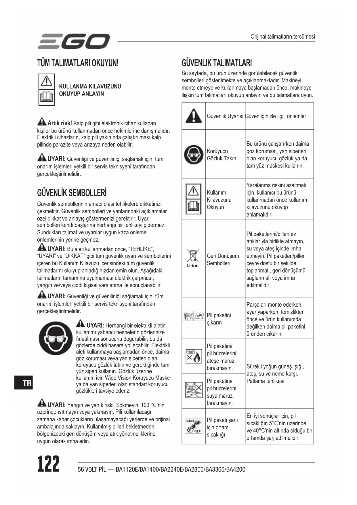 Bu lityum iyon pil paketi 5°C ila 40°C arasındaki sıcaklıklarda optimum performans sağlar. Pil paketi soğuduğunda, kendini ısıtmak üzere ilk dakika “duraklama” yapabilir. Pil paketini bir alete yerleştirin ve aleti haf bir uygulamada kullanın. Yaklaşık bir dakika sonra, pil paketi kendini ısıtmış olur ve normal şekilde çalışır. PİL PAKETİ NE ZAMAN ŞARJ EDİLMELİDİR UYARI: Lityum iyon pil paketleri kısmen şarj edilmiş olarak gönderilir. İlk olarak kullanmadan önce pil paketini tamamen şarj edin. UYARI: Bu pil paketi, pil ömrünü uzatmak üzere gelişmiş bir kendi kendine bakım işlevi ile donatılmıştır. Pilin şarjına bağlı olarak, bir aylık depolamanın ardından kendi kendini otomatik olarak deşarj edecektir. Bu kendi kendine bakım işleminin ardından, pil paketi uyku moduna girer ve şarj kapasitesinin %30’unu muhafaza eder. Bir ay veya daha uzun süre depolanmışsa, bir sonraki kullanımdan önce pili tamamen şarj edin.Yeniden şarj etmeden önce pil paketinin tamamen bitmiş olmasına gerek yoktur. Lityum iyon pili istediğiniz zaman şarj edebilirsiniz ve şarjı kısmen bittikten sonra şarj edilirse bir “hafıza” geliştirmeyecektir. Pil paketinin ne zaman şarj edilmesi gerektiğini belirlemek için güç göstergesini kullanın. PİL PAKETİ NASIL ŞARJ EDİLİR EGO CH5500E Hızlı Şarj Cihazı veya CH2100E Şarj Cihazı için Kullanım Kılavuzlarındaki talimatları izleyin. PİL PAKETİNİN SÖKÜLÜP TAKILMASI Özel EGO ürünü için Kullanım Kılavuzlarındaki talimatları izleyin. BAKIM UYARI: Ciddi kişisel yaralanmayı önlemek için, aksesuar değiştirilirken, temizlik veya bakım işlemi gerçekleştirirken daima pil paketini aletten çıkarın. UYARI: Bakım ve onarım sırasında sadece orijinal EGO yedek parçaları kullanın. Diğer parçaların kullanılması tehlike oluşturabilir veya ürünün hasar görmesine neden olabilir. UYARI: Pil paketini temizlemek için basınçlı kuru hava kullanılması tavsiye edilmez. Eğer uygulanabilecek tek temizlik yolu basınçlı hava ise, daima göz koruması veya yan siperleri olan koruyucu gözlük kullanın. Çalışma tozlu ise bir toz maskesi de takın. GENEL BAKIM Plastik parçaları temizlerken çözücü maddeler kullanmaktan kaçının. Plastikler çeşitli ticari çözücü türlerinden kötü yönde etkilenmeye yatkındır ve kullanılmaları durumunda zarar görebilirler. Kir, toz, yağ, gres, vb. gidermek için temiz bez kullanın. UYARI: Fren sıvıları, benzin, petrol bazlı ürünler, içe işleyen yağlar, vb.nin plastik parçalara temas etmesine kesinlikle izin vermeyin. Kimyasal maddeler plastik parçalara hasar verebilir, bu tür parçaları zayıatabilir veya parçalayabilir ve bu durum ciddi yaralanmalara neden olabilir. UYARI: KISA DEVRE SEBEBIYLE YANGIN, KIŞISEL YARALANMA VE ÜRÜN HASARI RISKINI AZALTMAK IÇIN ALETINIZI, PILI VEYA ŞARJ CIHAZINI ASLA SIVILARA DALDIRMAYIN VEYA BIR SIVININ IÇLERINE AKMASINA IZIN VERMEYIN. DENIZ SUYU, BELLI ENDÜSTRIYEL KIMYASALLAR VE AĞARTICILAR VB. GIBI AŞINDIRICI VEYA ILETKEN SIVILAR, KISA DEVREYE SEBEP OLABILIRLER. PİLLER Pil paketi Lityum iyon şarj edilebilir piller içermektedir. Her şarj işleminin ardından kullanım süresi, yapılan işe bağlıdır.BU aletteki piller sorunsuz olarak, maksimum kullanım ömrü sağlayacak şekilde tasarlanmıştır. Tüm piller gibi onlar da eninde sonunda yıpranacaktır.56 VOLT PİL — BA1120E/BA1400/BA2240E/BA2800/BA3360/BA4200126