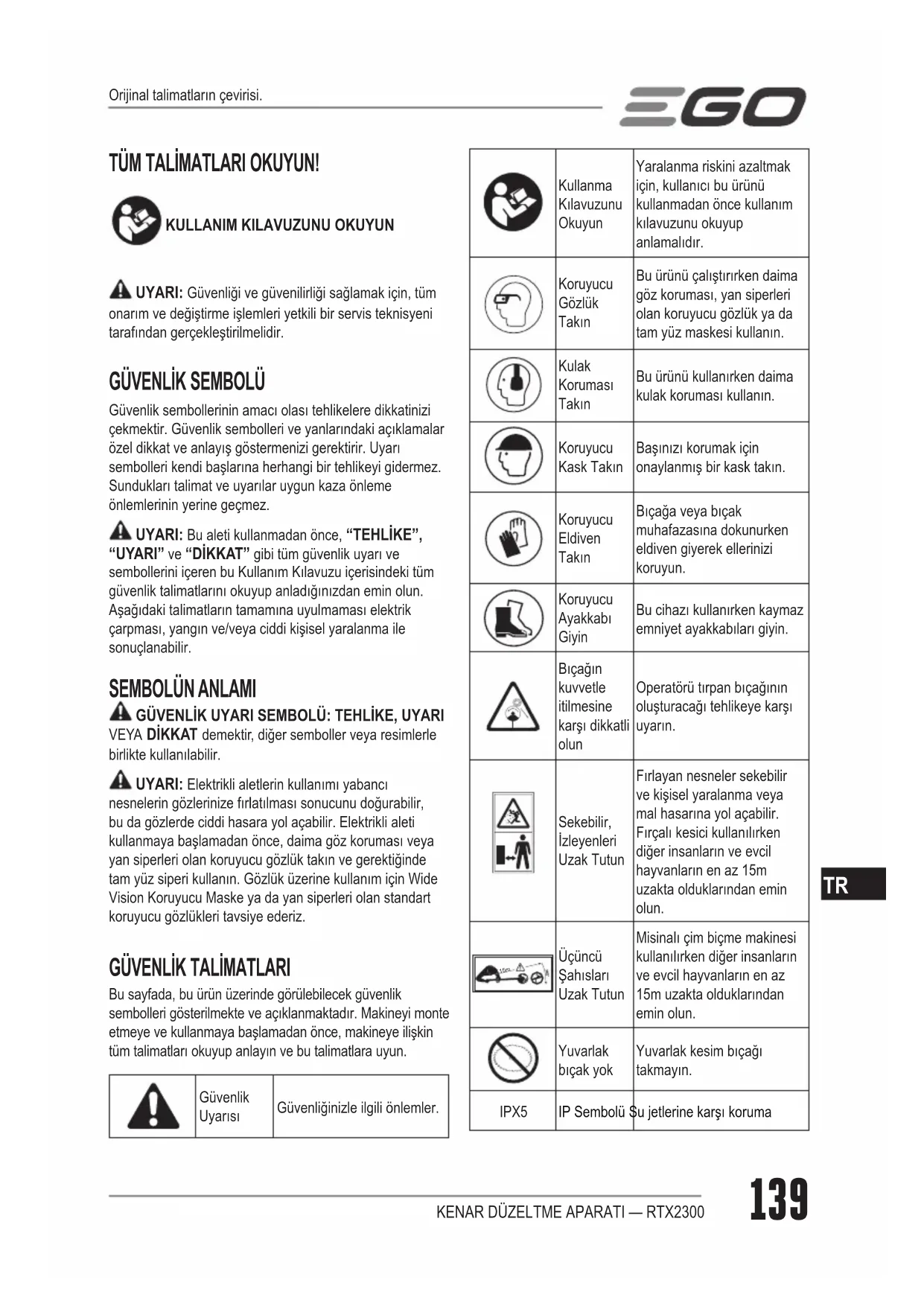 Bu sayfada, bu ürün üzerinde görülebilecek güvenlik sembolleri gösterilmekte ve açıklanmaktadır. Makineyi monte etmeye ve kullanmaya başlamadan önce, makineye ilişkin tüm talimatları okuyup anlayın ve bu talimatlara uyun. Güvenlik Uyarısı Güvenliğinizle ilgili önlemler. Kullanma Kılavuzunu Okuyun Yaralanma riskini azaltmak için, kullanıcı bu ürünü kullanmadan önce kullanım kılavuzunu okuyup anlamalıdır. Koruyucu Gözlük Takın Bu ürünü çalıştırırken daima göz koruması, yan siperleri olan koruyucu gözlük ya da tam yüz maskesi kullanın. Kulak Koruması Takın Bu ürünü kullanırken daima kulak koruması kullanın. Koruyucu Kask Takın Başınızı korumak için onaylanmış bir kask takın. Koruyucu Eldiven Takın Bıçağa veya bıçak muhafazasına dokunurken eldiven giyerek ellerinizi koruyun. Koruyucu Ayakkabı Giyin Bu cihazı kullanırken kaymaz emniyet ayakkabıları giyin. Bıçağın kuvvetle itilmesine karşı dikkatli olun Operatörü tırpan bıçağının oluşturacağı tehlikeye karşı uyarın. Sekebilir, İzleyenleri Uzak Tutun Fırlayan nesneler sekebilir ve kişisel yaralanma veya mal hasarına yol açabilir. Fırçalı kesici kullanılırken diğer insanların ve evcil hayvanların en az 15m uzakta olduklarından emin olun. 15m Üçüncü Şahısları Uzak Tutun Misinalı çim biçme makinesi kullanılırken diğer insanların ve evcil hayvanların en az 15m uzakta olduklarından emin olun. Yuvarlak bıçak yok Yuvarlak kesim bıçağı takmayın. IPX5 IP Sembolü Su jetlerine karşı koruma Orijinal talimatların çevirisi.KENAR DÜZELTME APARATI — RTX2300140
