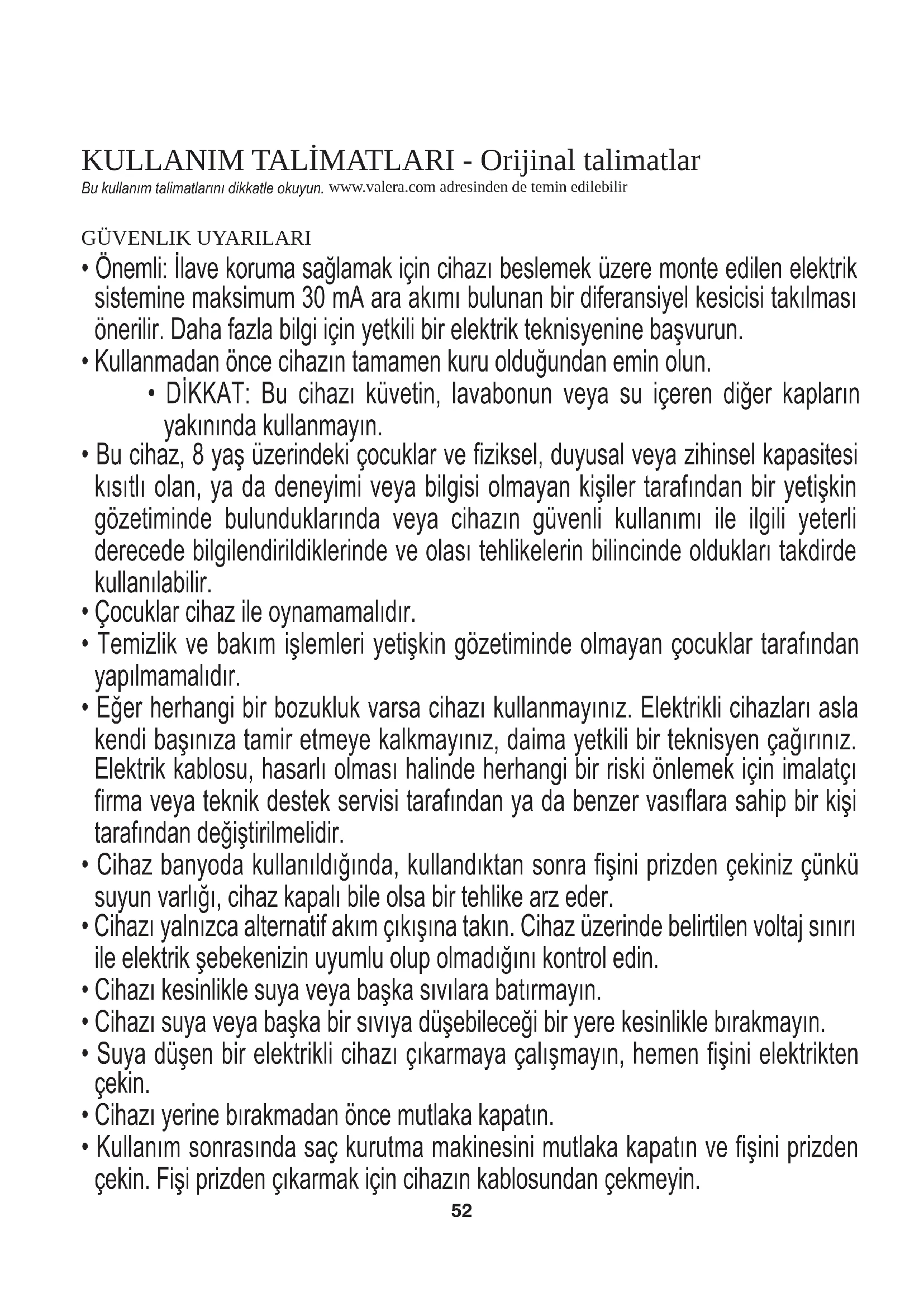 veya tamir edildiği taktirde, garanti süresi düşmektedir. Arıza olduğunda ürünü, iyi ambalajlanmış ve satıcı tarafından tarihi eklenerek mühürlenmiş olarak, yetkili yardım merkezimize geri getirebilir, ya da garantili onarım için resmi ithalatçıya gönderecek olan satıcınıza başvurabilirsiniz. Hava yoğunlaştırıcı Saçları hızlı bir şekilde kurutmak için ideal aksesuardır. Fırça yardımı ile en iyi sonuçların alınmasına olanak verir. Bu yoğunlaştırıcı sayesinde sıcak veya soğuk hava akımını tek bir saç tutamı üzerinde yoğunlaştırarak saçınıza istediğiniz şekli verebilirsiniz. Difüzör (bu aksesuarların bulunduğu cihazlar için) Saça hacim vermek ve kıvırcık veya permalı saçlara doğal bir yumuşaklık kazandırmak için ideal bir aksesuardır. Halen nemli haldeki (fakat ıslak olmayan) saç tutamlarını alın ve yukarıya doğru tutun, difüzörden gelen havanın parmaklarınızın arasından geçmesine izin vererek kurutun. Difüzörün montajı: bkz şekil 1 Dikkat: dağıtıcı parçayı alete taktığınızda sadece en düşük hız/ısı ayarında kurutma yapın. Filtre (bu aksesuarın bulunduğu modeller için) Saç kurutma makinesi, toz ve saç kalıntılarının fanda birikmesini önleyen, çıkarılabilir bir filtre ile donatılmıştır. Filtre su altına tutularak yıkanabilir. Filtreyi saç kurutma makinesinden çıkarmak için arkadaki hava giriş ızgarasını ayırmak yeterlidir. Filtreyi temizledikten sonra tekrar makineye takmadan önce tamamen kuru olmasına özen gösterin. Sonra arka ızgarayı makineye tekrar takın. Ionic Care (bu aygıtın bulunduğu saç kurutma makineleri için) Bu fonksiyon milyonlarca arındırıcı negatif iyon üreten bir jeneratör ile ilişkilidir. İyonlar nedir? İyonlar doğada bulunan elektrik yüklü partiküllerdir. Negatif yüklü iyonlar, kirletici maddelerin büyük bir kısmını atmosferde tutmak suretiyle havanın kirlenmesine katkıda bulunan pozitif yüklü iyonları nötrleştirerek, bunların tam tersine havanın temizlenmesine yardımcı olurlar. Saçlarınız için en iyi nemlendirme Negatif yüklü iyonlar saçtaki nemin gereken şekilde muhafaza edilmesine yardımcı olur. Bunlar esas olarak yeni yıkanmış saçların üzerinde bulunan su partiküllerini mikronize ederek saç telinin üzerinde daha fazla miktarda bir emilim sağlamak suretiyle saçın doğal nem dengesini düzenlerler. Saçta balsam etkisi Daha iyi nemlendirme saçlarınızın yumuşatılmasına yardımcı olur, canlandırıcı bir etkisi vardır ve saçları daha yumuşak ve kolay taranır kılmakla birlikte hacim ve ışıltı kazandırır. Elektrostatik yük veya “fly away” etkisi giderme Negatif yüklü iyonlar saçlardaki elektrostatik yükü ve “fly away” etkisini (kabarık saçlar) ve buruşukluğu azaltmaya yardımcı olurlar. VALERA tescilli bir LIGO PATENTS SA - İsviçre markasıdır.55 Українськa ІНСТРУКЦІЯ З ЕКСПЛУАТАЦІЇ - Оригінальні інструкції Уважно прочитайте цю інструкцію. Доступні також на сайті www.valera.com ПОПЕРЕДЖЕННЯ