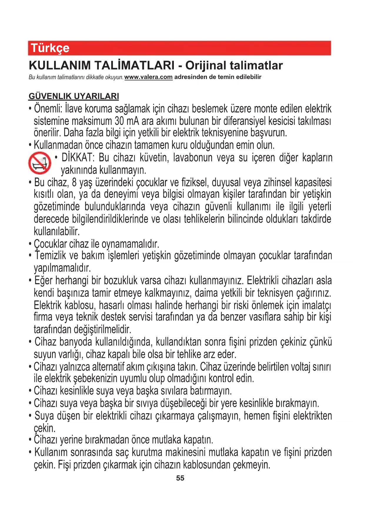 - DİKKAT: Bu cihazı küvetin, lavabonun veya su içeren diğer kapların yakınında kullanmayın.