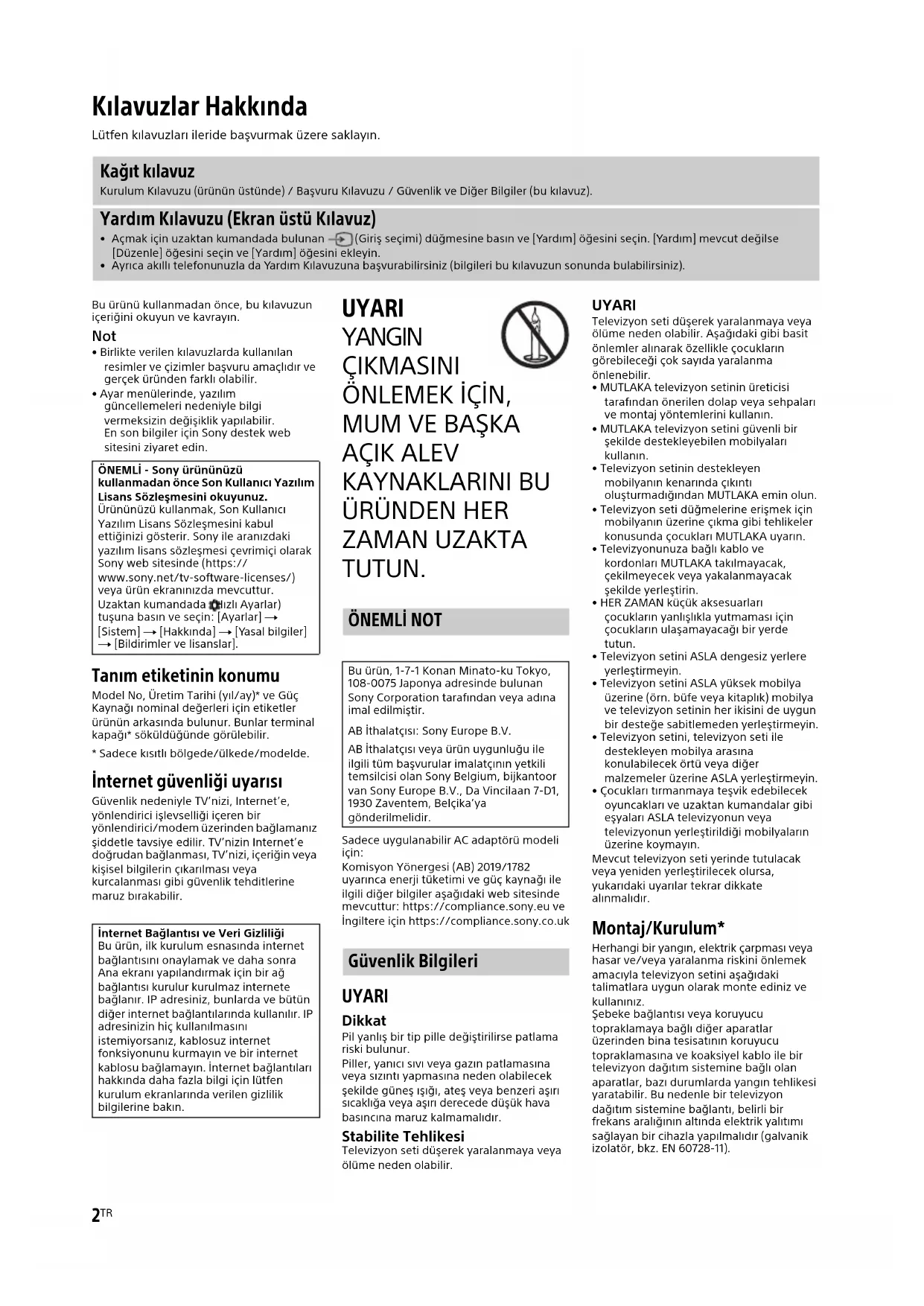 ZAMAN UZAKTA TUTUN. Sadece uygulanabilir AC adaptörü modeli için:Komisyon Yönergesi (AB) 2019/1782 uyarınca enerji tüketimi ve güç kaynağı ile ilgili diğer bilgiler aşağıdaki web sitesinde mevcuttur: https://compliance.sony.eu ve İngiltere için https://compliance.sony.co.uk UYARI Dikkat Pil yanlış bir tip pille değiştirilirse patlama riski bulunur.Piller, yanıcı sıvı veya gazın patlamasına veya sızıntı yapmasına neden olabilecek şekilde güneş ışığı, ateş veya benzeri aşırı sıcaklığa veya aşırı derecede düşük hava basıncına maruz kalmamalıdır. Stabilite Tehlikesi Televizyon seti düşerek yaralanmaya veya ölüme neden olabilir. UYARI Televizyon seti düşerek yaralanmaya veya ölüme neden olabilir. Aşağıdaki gibi basit önlemler alınarak özellikle çocukların görebileceği çok sayıda yaralanma önlenebilir.• MUTLAKA televizyon setinin üreticisi tarafından önerilen dolap veya sehpaları ve montaj yöntemlerini kullanın.• MUTLAKA televizyon setini güvenli bir şekilde destekleyebilen mobilyaları kullanın.• Televizyon setinin destekleyen mobilyanın kenarında çıkıntı oluşturmadığından MUTLAKA emin olun.• Televizyon seti düğmelerine erişmek için mobilyanın üzerine çıkma gibi tehlikeler konusunda çocukları MUTLAKA uyarın.• Televizyonunuza bağlı kablo ve kordonları MUTLAKA takılmayacak, çekilmeyecek veya yakalanmayacak şekilde yerleştirin.• HER ZAMAN küçük aksesuarları çocukların yanlışlıkla yutmaması için çocukların ulaşamayacağı bir yerde tutun.• Televizyon setini ASLA dengesiz yerlere yerleştirmeyin.• Televizyon setini ASLA yüksek mobilya üzerine (örn. büfe veya kitaplık) mobilya ve televizyon setinin her ikisini de uygun bir desteğe sabitlemeden yerleştirmeyin.• Televizyon setini, televizyon seti ile destekleyen mobilya arasına konulabilecek örtü veya diğer malzemeler üzerine ASLA yerleştirmeyin.• Çocukları tırmanmaya teşvik edebilecek oyuncakları ve uzaktan kumandalar gibi eşyaları ASLA televizyonun veya televizyonun yerleştirildiği mobilyaların üzerine koymayın.Mevcut televizyon seti yerinde tutulacak veya yeniden yerleştirilecek olursa, yukarıdaki uyarılar tekrar dikkate alınmalıdır. Montaj/Kurulum* Herhangi bir yangın, elektrik çarpması veya hasar ve/veya yaralanma riskini önlemek amacıyla televizyon setini aşağıdaki talimatlara uygun olarak monte ediniz ve kullanınız.Şebeke bağlantısı veya koruyucu topraklamaya bağlı diğer aparatlar üzerinden bina tesisatının koruyucu topraklamasına ve koaksiyel kablo ile bir televizyon dağıtım sistemine bağlı olan aparatlar, bazı durumlarda yangın tehlikesi yaratabilir. Bu nedenle bir televizyon dağıtım sistemine bağlantı, belirli bir frekans aralığının altında elektrik yalıtımı sağlayan bir cihazla yapılmalıdır (galvanik izolatör, bkz. EN 60728-11). Kılavuzlar Hakkında Lütfen kılavuzları ileride başvurmak üzere saklayın. Kağıt kılavuz Kurulum Kılavuzu (ürünün üstünde) / Başvuru Kılavuzu / Güvenlik ve Diğer Bilgiler (bu kılavuz). Yardım Kılavuzu (Ekran üstü Kılavuz)