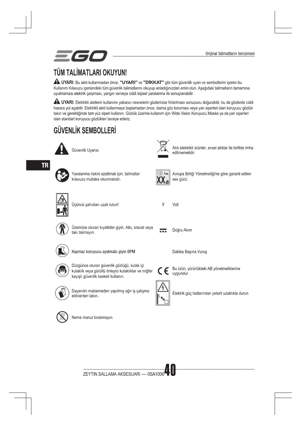 Volt Üzerinize oturan kıyafetler giyin. Atkı, kravat veya takı takmayın.Doğru AkımKaymaz koruyucu ayakkabı giyin BPMDakika Başına VuruşDüzgünce oturan güvenlik gözlüğü, kulak içi kulaklık veya gürültü önleyici kulaklıklar ve miğfer kayışlı güvenlik kasketi kullanın.Bu ürün, yürürlükteki AB yönetmeliklerine uygundur.Dayanıklı malzemeden yapılmış ağır iş çalışma eldivenleri takın.Elektrik güç hatlarından yeterli uzaklıkta durunNeme maruz bırakmayın.Orijinal talimatların tercümesiZEYTIN SALLAMA AKSESUARI — OSA1000 41