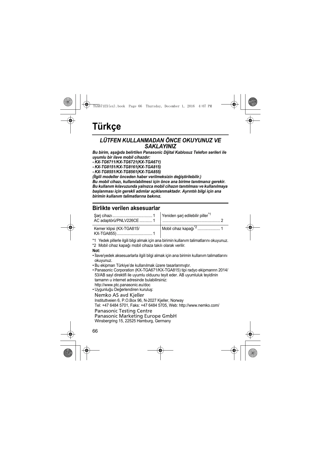 SAKLAYINIZ Bu birim, aşağıda belirtilen Panasonic Dijital Kablosuz Telefon serileri ile uyumlu bir ilave mobil cihazdır: - KX-TG6711/KX-TG6721(KX-TGA671) - KX-TG8151/KX-TG8161(KX-TGA815) - KX-TG8551/KX-TG8561(KX-TGA855) (İlgili modeller önceden haber verilmeksizin değiştirilebilir.) Bu mobil cihazı, kullanılabilmesi için önce ana birime tanıtmanız gerekir. Bu kullanım kılavuzunda yalnızca mobil cihazın tanıtılması ve kullanılmaya başlanması için gerekli adımlar açıklanmaktadır. Ayrıntılı bilgi için ana birimin kullanım talimatlarına bakınız. Birlikte verilen aksesuarlar Şarj cihazı..................................... 1 AC adaptörü/PNLV226CE ............ 1 Yeniden şarj edilebilir piller*1