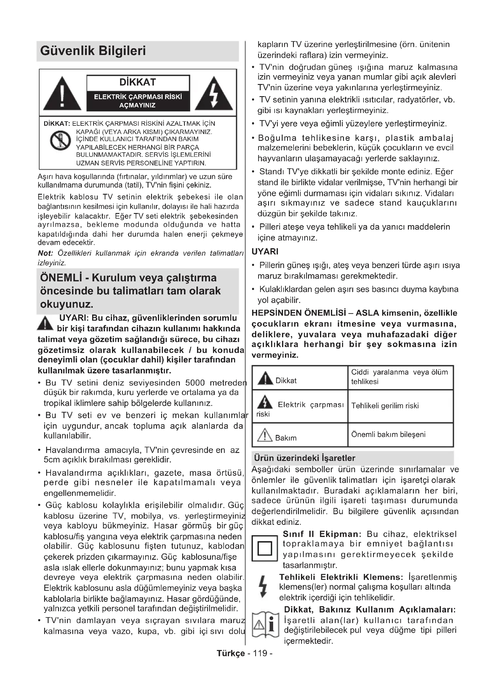 - Eski Ekipmanların ve Pillerin Bertaraf Edilmesi 154 Uygunluk Beyanı (DoC) Türkçe - 119 - Güvenlik Bilgileri DİKKAT ELEKTRİK ÇARPMASI RİSKİAÇMAYINIZDİKKAT: ELEKTRİK ÇARPMASI RİSKİNİ AZALTMAK İÇİN KAPAĞI (VEYA ARKA KISMI) ÇIKARMAYINIZ. İÇİNDE KULLANICI TARAFINDAN BAKIM YAPILABİLECEK HERHANGİ BİR PARÇA BULUNMAMAKTADIR. SERVİS İŞLEMLERİNİ UZMAN SERVİS PERSONELİNE YAPTIRIN.Not: Özellikleri kullanmak için ekranda verilen talimatları izleyiniz.Aşırı hava koşullarında (fırtınalar, yıldırımlar) ve uzun süre kullanılmama durumunda (tatil), TV'nin fişini çekiniz.Elektrik kablosu TV setinin elektrik şebekesi ile olan bağlantısının kesilmesi için kullanılır, dolayısı ile hali hazırda işleyebilir kalacaktır. Eğer TV seti elektrik şebekesinden ayrılmazsa, bekleme modunda olduğunda ve hatta kapatıldığında dahi her durumda halen enerji çekmeye devam edecektir. ÖNEMLİ - Kurulum veya çalıştırma öncesinde bu talimatları tam olarak okuyunuz. UYARI: Bu cihaz, güvenliklerinden sorumlu bir kişi tarafından cihazın kullanımı hakkında talimat veya gözetim sağlandığı sürece, bu cihazı gözetimsiz olarak kullanabilecek / bu konuda deneyimli olan (çocuklar dahil) kişiler tarafından kullanılmak üzere tasarlanmıştır. p. 154