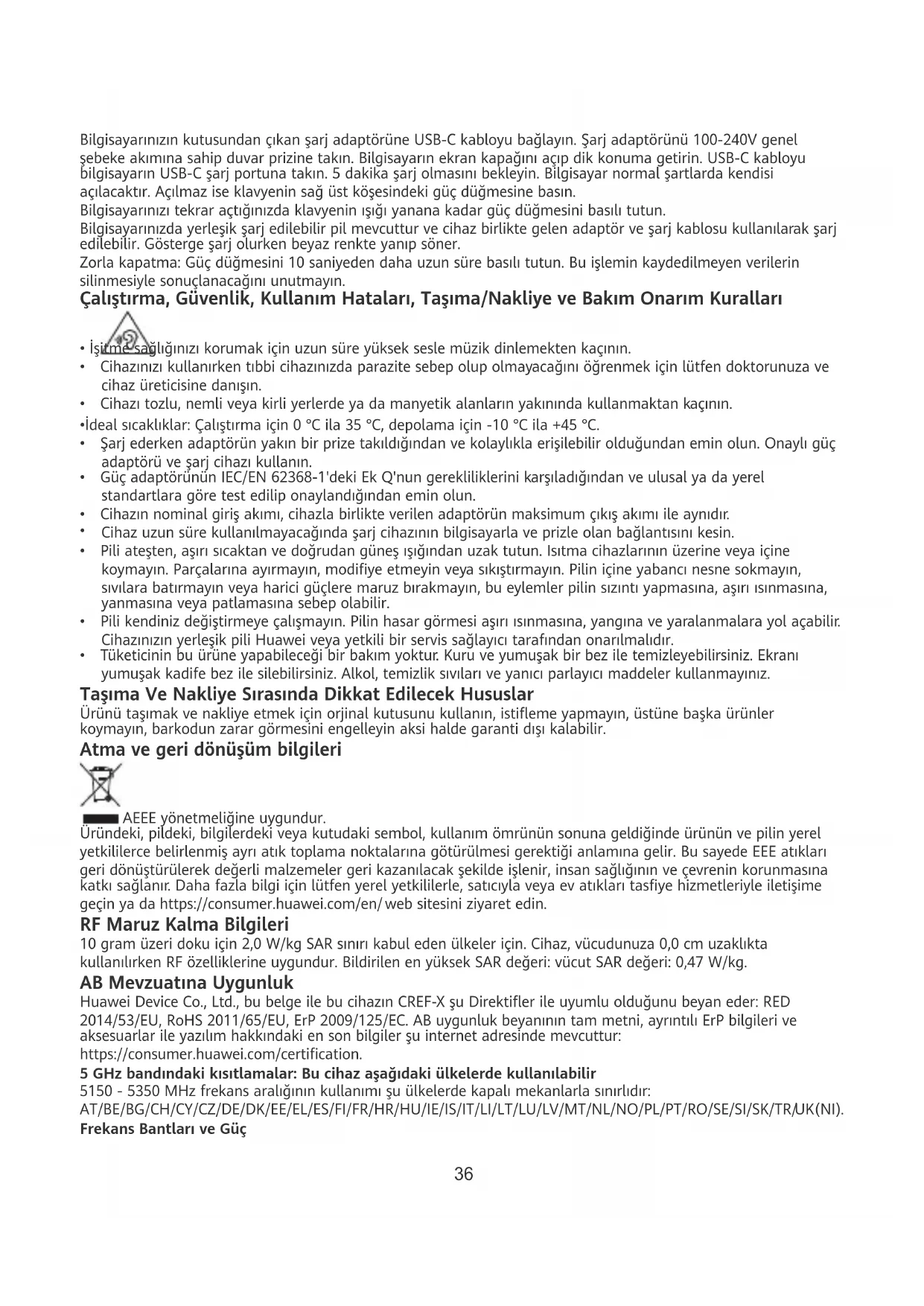 Taajuusalueet ja teho Wi-Fi 2.4GHz: 20 dBm, Bluetooth 2.4GHz: 13 dBm, Wi-Fi 5GHz: 5150-5350 MHz: 23 dBm, 5470-5725 MHz: 23 dBm, 5725-5850 MHz: 14 dBm, Wi-Fi 6GHz: 5945-6425 MHz: 23 dBm Tuetut taajuusalueet voivat vaihdella maittain tai alueittain. Tavaramerkit ja luvat Tietokoneessa on esiasennettuna kolmannen osapuolen käyttöjärjestelmä, tai siinä ei ole esiasennettuna mitään järjestelmää. Kolmannen osapuolen käyttöjärjestelmän tavaramerkki kuuluu kyseiselle kolmannelle osapuolelle. Esimerkiksi Microsoft ja Windows ovat Microsoftin tavaramerkkejä. Thunderbolt ja Thunderbolt-logo ovat Intel Corporationin tai sen tytäryhtiöiden tavaramerkkejä. Türkçe Cihazı kullanmadan önce https://consumer.huawei.com/tr/support/ adresinde bulunan kullanıcı kılavuzunu ve cihaz hakkında diğer bilgileri inceleyin. Açma ve şarj etme Bilgisayarınızı ilk defa kullanırken bir güç kaynağına bağlayın, ardından cihaz açılacaktır. 35Bilgisayarınızın kutusundan çıkan şarj adaptörüne USB-C kabloyu bağlayın. Şarj adaptörünü 100-240V genel şebeke akımına sahip duvar prizine takın. Bilgisayarın ekran kapağını açıp dik konuma getirin. USB-C kabloyu bilgisayarın USB-C şarj portuna takın. 5 dakika şarj olmasını bekleyin. Bilgisayar normal şartlarda kendisi açılacaktır. Açılmaz ise klavyenin sağ üst köşesindeki güç düğmesine basın. Bilgisayarınızı tekrar açtığınızda klavyenin ışığı yanana kadar güç düğmesini basılı tutun. Bilgisayarınızda yerleşik şarj edilebilir pil mevcuttur ve cihaz birlikte gelen adaptör ve şarj kablosu kullanılarak şarj edilebilir. Gösterge şarj olurken beyaz renkte yanıp söner. Zorla kapatma: Güç düğmesini 10 saniyeden daha uzun süre basılı tutun. Bu işlemin kaydedilmeyen verilerin silinmesiyle sonuçlanacağını unutmayın. Çalıştırma, Güvenlik, Kullanım Hataları, Taşıma/Nakliye ve Bakım Onarım Kuralları