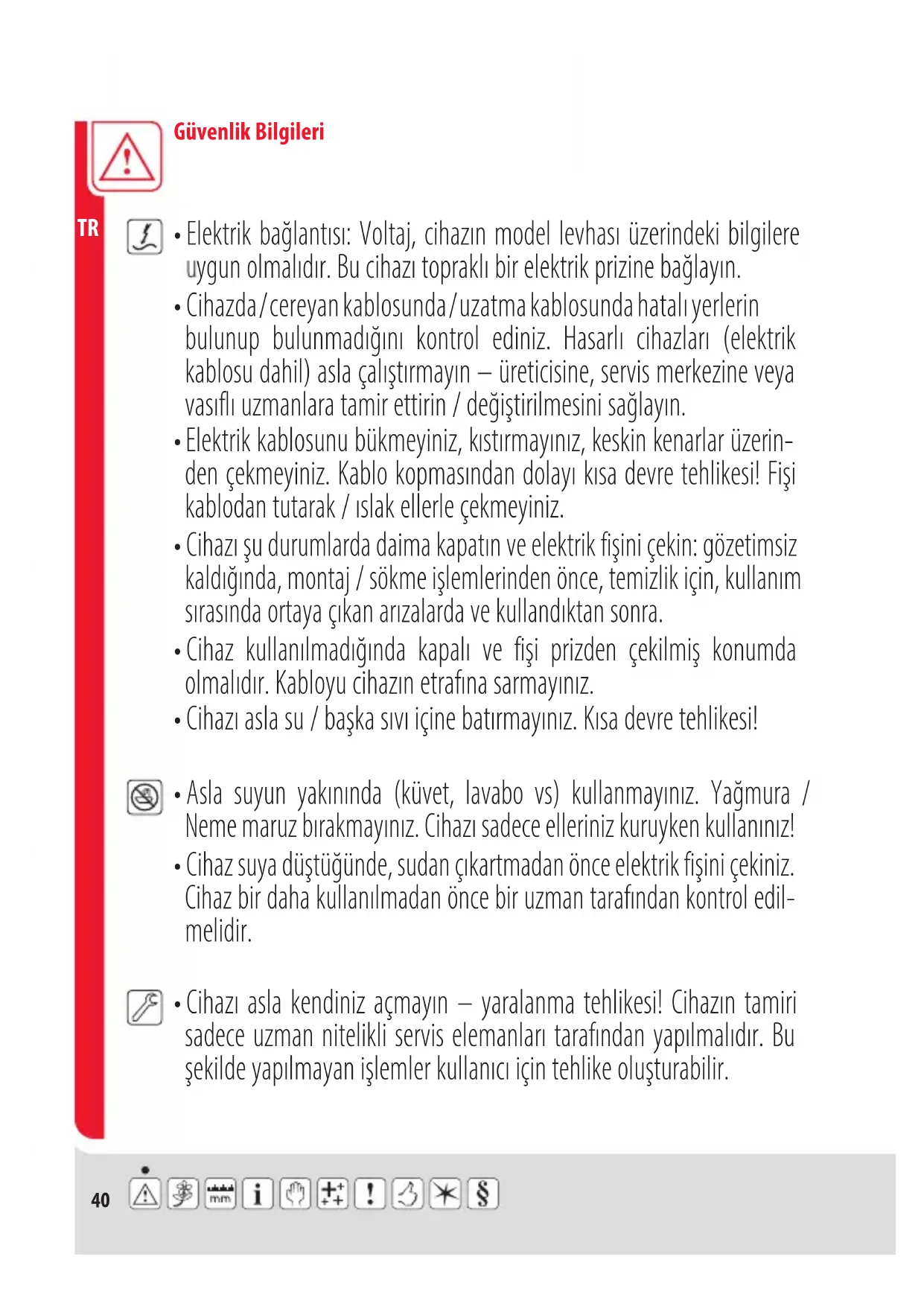- Cihazı asla kendiniz açmayın – yaralanma tehlikesi! Cihazın tamiri sadece uzman nitelikli servis elemanları tarafından yapılmalıdır. Bu şekilde yapılmayan işlemler kullanıcı için tehlike oluşturabilir.41 Güvenlik Bilgileri