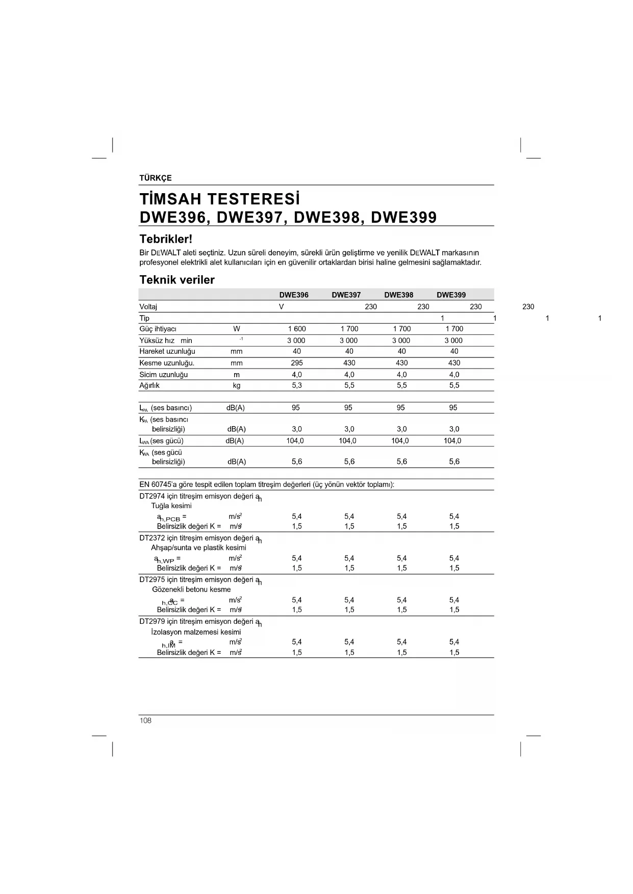 vidasını sıkın. UYARI: İşlemden önce testere bıçaklarını yaklaşık 20 sn. serbest çalıştırın. Testere Bıçakları Kat. No. Kesilecek malzeme Önerilen testere bıçağı tipi DWE396 Pürüzlü ahşap HSS DT2970 İşlenmiş ahşap HSS DT2971 İşlenmiş ahşap TCT DT2972 Düşük yoğunluklu tuğla TCT T12 DT2973 Orta yoğunluklu tuğla TCT T20 DT2977 Kat. No. Kesilecek malzeme Önerilen testere bıçağı tipi DWE397 Pürüzlü ahşap HSS DT2978 Düşük yoğunluklu tuğla TCT T12 DT2974 Orta yoğunluklu tuğla TCT T20 DT2976 İzolasyon malzemeleri HSS DT2979 Hücreli beton TCT 12 DT2975 DWE398 Pürüzlü ahşap HSS DT2978 Düşük yoğunluklu tuğla TCT T12 DT2974 Orta yoğunluklu tuğla TCT T20 DT2976 İzolasyon malzemeleri HSS DT2979 Hücreli beton TCT 12 DT2975 DWE399 Pürüzlü ahşap HSS DT2978 Düşük yoğunluklu tuğla TCT T12 DT2974 Orta yoğunluklu tuğla TCT T20 DT2976 İzolasyon malzemeleri HSS DT2979 Hücreli beton TCT 12 DT2975 Kullanmadan oÅNnce (şekil 1)