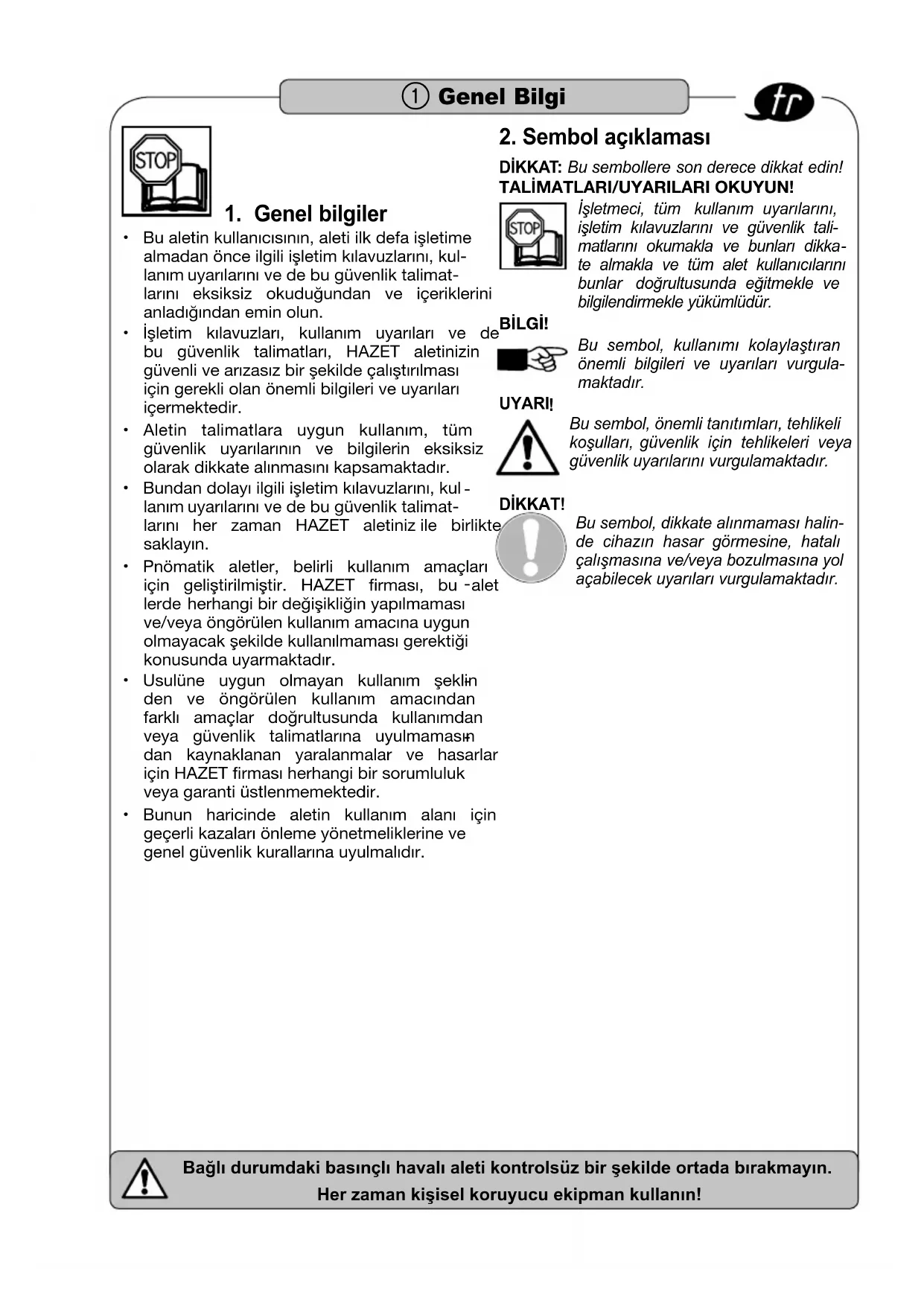 DIKKAT: Bu sembollere son derece dikkat edin! TALİMATLARI/UYARILARI OKUYUN! İşletmeci, tüm kullanım uyarılarını, işletim kılavuzlarını ve güvenlik tali- matlarını okumakla ve bunları dikka- te almakla ve tüm alet kullanıcılarını bunlar doğrultusunda eğitmekle ve bilgilendirmekle yükümlüdür. BİLGİ! Bu sembol, kullanımı kolaylaştıran önemli bilgileri ve uyarıları vurgula- maktadır. UYARI