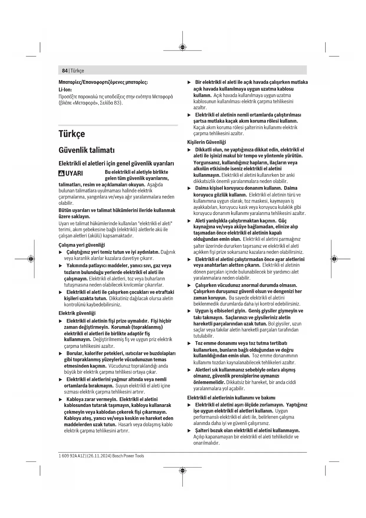 Τα ηλεκτρικά εργαλεία, οι μπαταρίες, τα εξαρτή- ματα και οι συσκευασίες πρέπει να ανακυκλώνο- νται με τρόπο φιλικό προς το περιβάλλον. Μην ρίχνετε τα ηλεκτρικά εργαλεία και τις μπατα- ρίες στα απορρίμματα του σπιτιού σας! Μόνο για χώρες τηςΕΕ: Τα άχρηστα ηλεκτρικά εργαλεία και οι χαλασμένες ή χρησιμο- ποιημένες μπαταρίες πρέπει να αποσύρονται ξεχωριστά. Χρη- σιμοποιείτε τα προβλεπόμενα συστήματα συλλογής. Εάν οι παλαιές ηλεκτρικές και ηλεκτρονικές συσκευές απορρί- πτονται με ακατάλληλο τρόπο, μπορεί να έχουν επιβλαβείς επι- πτώσεις στο περιβάλλον και την ανθρώπινη υγεία λόγω της πι- θανής παρουσίας επικίνδυνων ουσιών. Bosch Power Tools 1 609 92A A1Z | (26.11.2024)84 | Türkçe Μπαταρίες/Επαναφορτιζόμενες μπαταρίες: Li-Ion: Προσέξτε παρακαλώ τις υποδείξεις στην ενότητα Μεταφορά (βλέπε «Μεταφορά», Σελίδα83). Türkçe Güvenlik talimatı Elektrikli el aletleri için genel güvenlik uyarıları UYARI Bu elektrikli el aletiyle birlikte gelen tüm güvenlik uyarılarını, talimatları, resim ve açıklamaları okuyun. Aşağıda bulunan talimatlara uyulmaması halinde elektrik çarpmalarına, yangınlara ve/veya ağır yaralanmalara neden olabilir. Bütün uyarıları ve talimat hükümlerini ileride kullanmak üzere saklayın. Uyarı ve talimat hükümlerinde kullanılan "elektrikli el aleti" terimi, akım şebekesine bağlı (elektrikli) aletlerle akü ile çalışan aletleri (akülü) kapsamaktadır. Çalışma yeri güvenliği u Çalıştığınız yeri temiz tutun ve iyi aydınlatın. Dağınık veya karanlık alanlar kazalara davetiye çıkarır. u Yakınında patlayıcı maddeler, yanıcı sıvı, gaz veya tozların bulunduğu yerlerde elektrikli el aleti ile çalışmayın. Elektrikli el aletleri, toz veya buharların tutuşmasına neden olabilecek kıvılcımlar çıkarırlar. u Elektrikli el aleti ile çalışırken çocukları ve etraftaki kişileri uzakta tutun. Dikkatiniz dağılacak olursa aletin kontrolünü kaybedebilirsiniz. Elektrik güvenliği u Elektrikli el aletinin fişi prize uymalıdır. Fişi hiçbir zaman değiştirmeyin. Korumalı (topraklanmış) elektrikli el aletleri ile birlikte adaptör fiş kullanmayın. Değiştirilmemiş fiş ve uygun priz elektrik çarpma tehlikesini azaltır. u Borular, kalorifer petekleri, ısıtıcılar ve buzdolapları gibi topraklanmış yüzeylerle vücudunuzun temas etmesinden kaçının. Vücudunuz topraklandığı anda büyük bir elektrik çarpma tehlikesi ortaya çıkar. u Elektrikli el aletlerini yağmur altında veya nemli ortamlarda bırakmayın. Suyun elektrikli el aleti içine sızması elektrik çarpma tehlikesini artırır. u Kabloya zarar vermeyin. Elektrikli el aletini kablosundan tutarak taşımayın, kabloyu kullanarak çekmeyin veya kablodan çekerek fişi çıkarmayın. Kabloyu ateş, yanıcı ve/veya keskin ve hareket eden maddelerden uzak tutun. Hasarlı veya dolaşmış kablo elektrik çarpma tehlikesini artırır. u Bir elektrikli el aleti ile açık havada çalışırken mutlaka açık havada kullanılmaya uygun uzatma kablosu kullanın. Açık havada kullanılmaya uygun uzatma kablosunun kullanılması elektrik çarpma tehlikesini azaltır. u Elektrikli el aletinin nemli ortamlarda çalıştırılması şartsa mutlaka kaçak akım koruma rölesi kullanın. Kaçak akım koruma rölesi şalterinin kullanımı elektrik çarpma tehlikesini azaltır. Kişilerin Güvenliği u Dikkatli olun, ne yaptığınıza dikkat edin, elektrikli el aleti ile işinizi makul bir tempo ve yöntemle yürütün. Yorgunsanız, kullandığınız hapların, ilaçların veya alkolün etkisinde iseniz elektrikli el aletini kullanmayın. Elektrikli el aletini kullanırken bir anki dikkatsizlik önemli yaralanmalara neden olabilir. u Daima kişisel koruyucu donanım kullanın. Daima koruyucu gözlük kullanın. Elektrikli el aletinin türü ve kullanımına uygun olarak; toz maskesi, kaymayan iş ayakkabıları, koruyucu kask veya koruyucu kulaklık gibi koruyucu donanım kullanımı yaralanma tehlikesini azaltır. u Aleti yanlışlıkla çalıştırmaktan kaçının. Güç kaynağına ve/veya aküye bağlamadan, elinize alıp taşımadan önce elektrikli el aletinin kapalı olduğundan emin olun. Elektrikli el aletini parmağınız şalter üzerinde dururken taşırsanız ve elektrikli el aleti açıkken fişi prize sokarsanız kazalara neden olabilirsiniz. u Elektrikli el aletini çalıştırmadan önce ayar aletlerini veya anahtarları aletten çıkarın. Elektrikli el aletinin dönen parçaları içinde bulunabilecek bir yardımcı alet yaralanmalara neden olabilir. u Çalışırken vücudunuz anormal durumda olmasın. Çalışırken duruşunuz güvenli olsun ve dengenizi her zaman koruyun. Bu sayede elektrikli el aletini beklenmedik durumlarda daha iyi kontrol edebilirsiniz. u Uygun iş elbiseleri giyin. Geniş giysiler giymeyin ve takı takmayın. Saçlarınızı ve giysileriniz aletin hareketli parçalarından uzak tutun. Bol giysiler, uzun saçlar veya takılar aletin hareketli parçaları tarafından tutulabilir. u Toz emme donanımı veya toz tutma tertibatı kullanırken, bunların bağlı olduğundan ve doğru kullanıldığından emin olun. Toz emme donanımının kullanımı tozdan kaynalanabilecek tehlikeleri azaltır. u Aletleri sık kullanmanız sebebiyle onlara alışmış olmanız, güvenlik prensiplerine uymanı
