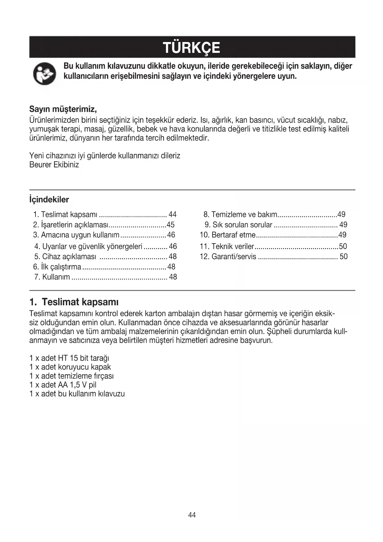 anmayın ve satıcınıza veya belirtilen müşteri hizmetleri adresine başvurun. 1 x adet HT 15 bit tarağı 1 x adet koruyucu kapak 1 x adet temizleme fırçası 1 x adet AA 1,5 V pil 1 x adet bu kullanım kılavuzu İçindekiler45