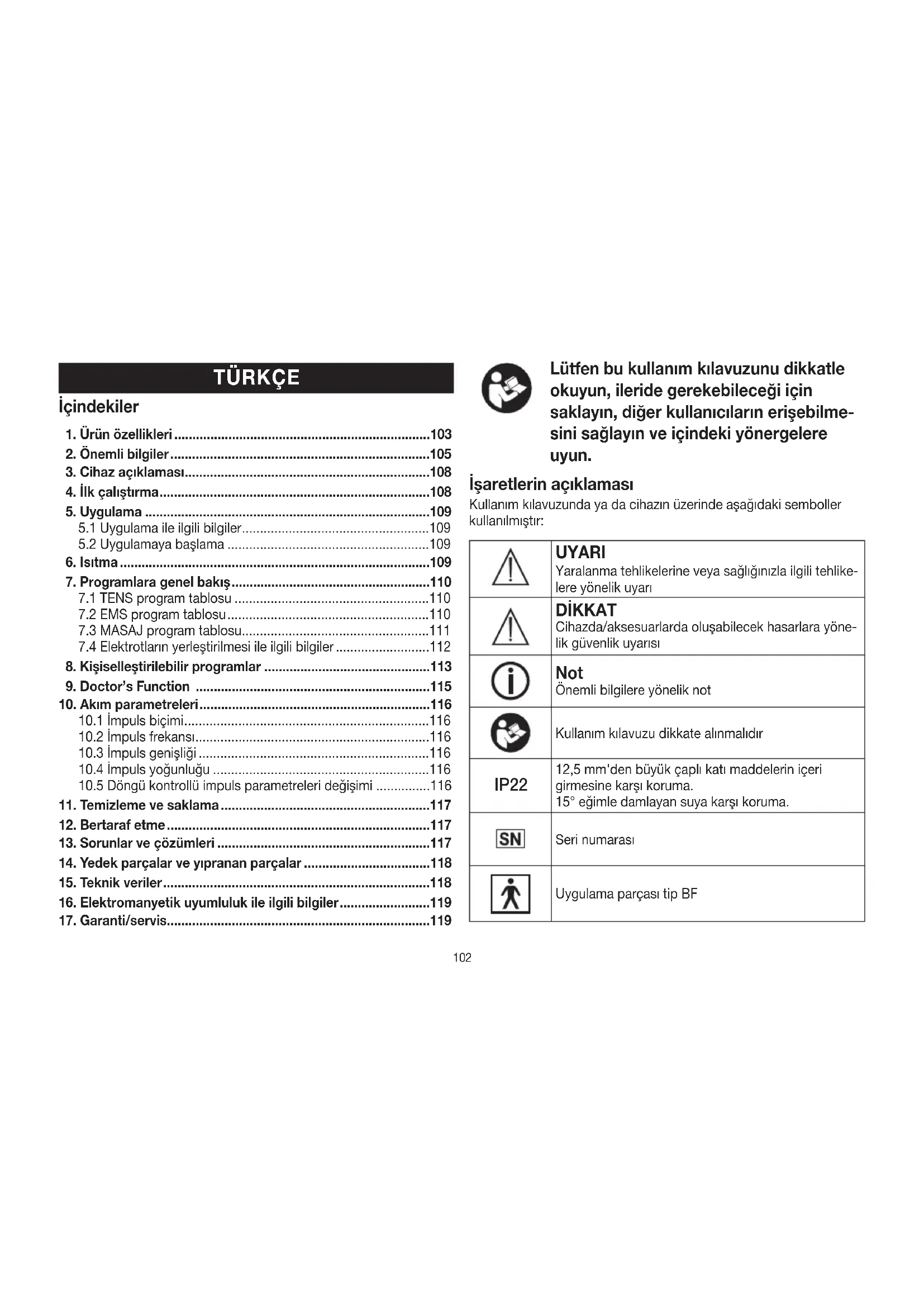 Isıtma Fonksiyonlu Dijital TENS/EMS Kullanım kılavuzu .......................................102