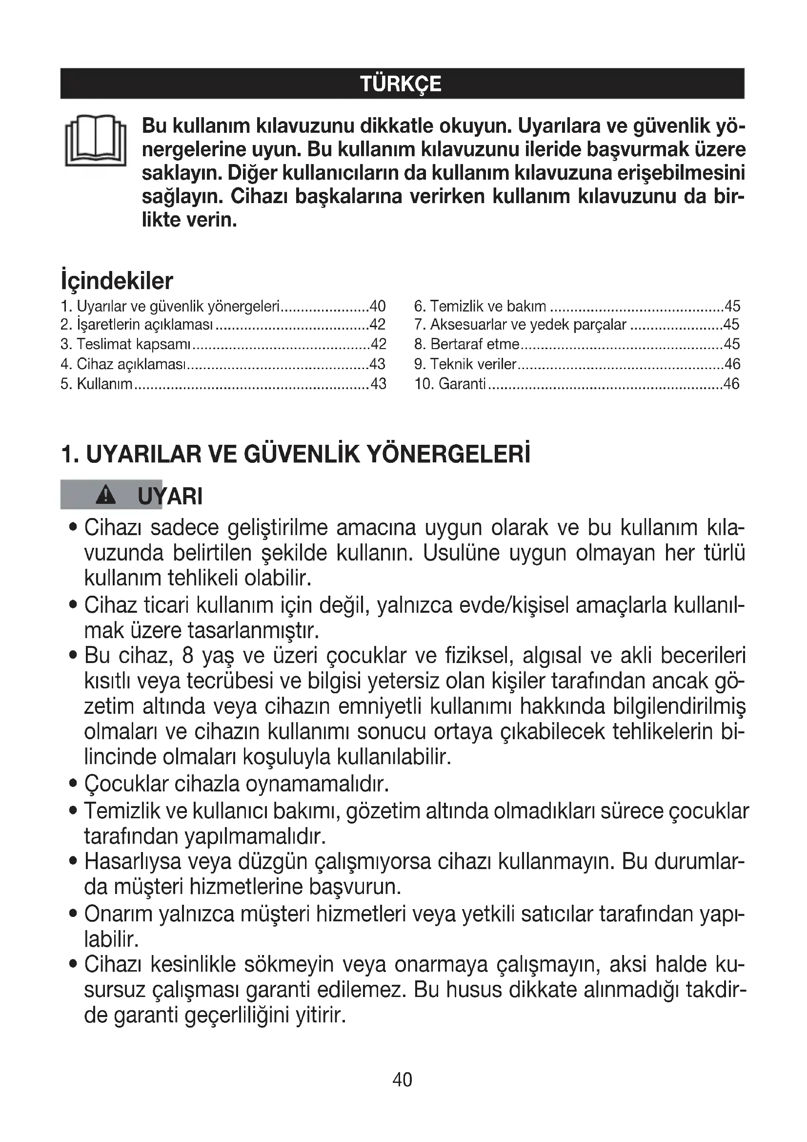 Per ulteriori informazioni sulla garanzia e sulle condizioni di garanzia, consultare la scheda di garanzia fornita. Possibili errori e variazioni40 Bu kullanım kılavuzunu dikkatle okuyun. Uyarılara ve güvenlik yö- nergelerine uyun. Bu kullanım kılavuzunu ileride başvurmak üzere saklayın. Diğer kullanıcıların da kullanım kılavuzuna erişebilmesini sağlayın. Cihazı başkalarına verirken kullanım kılavuzunu da bir