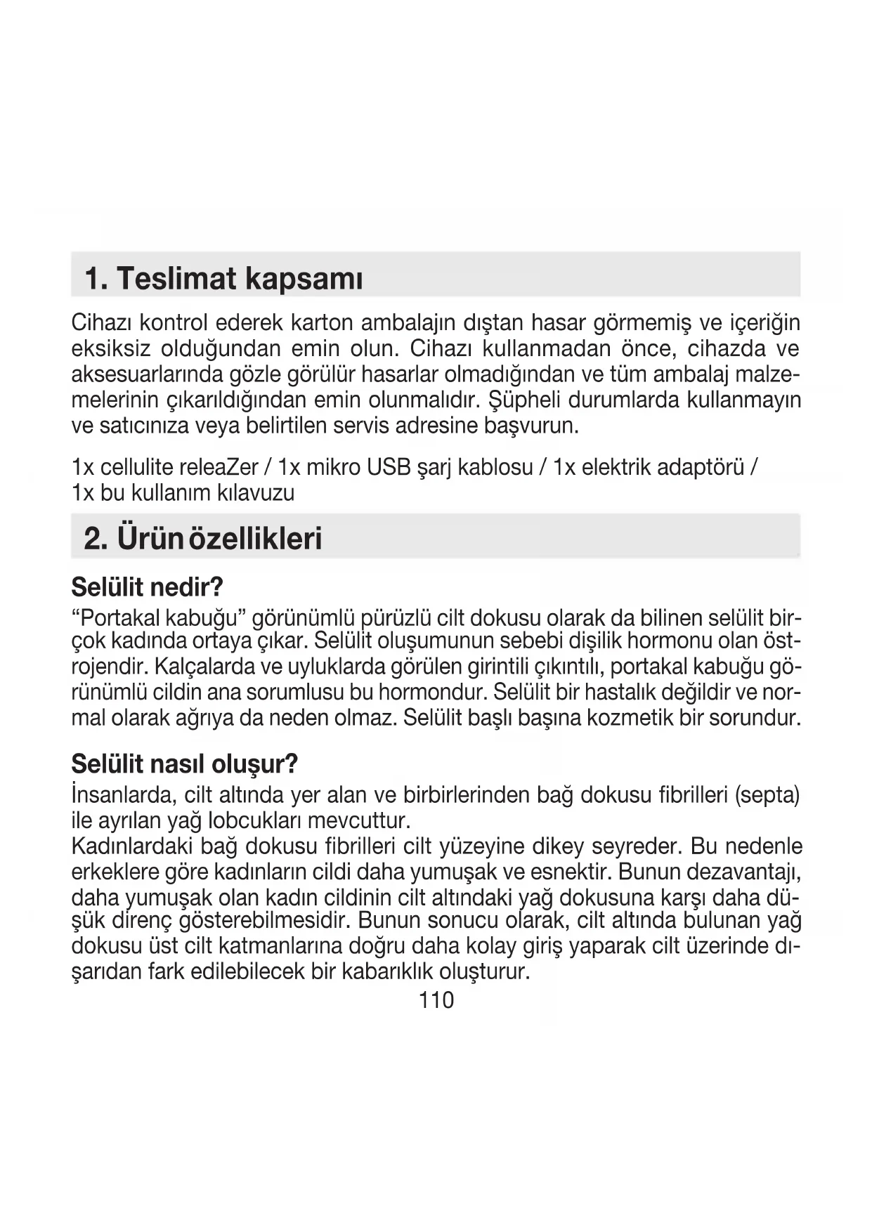 Cihazı kontrol ederek karton ambalajın dıştan hasar görmemiş ve içeriğin eksiksiz olduğundan emin olun. Cihazı kullanmadan önce, cihazda ve aksesuarlarında gözle görülür hasarlar olmadığından ve tüm ambalaj malze- melerinin çıkarıldığından emin olunmalıdır. Şüpheli durumlarda kullanmayın ve satıcınıza veya belirtilen servis adresine başvurun. 1x cellulite releaZer / 1x mikro USB şarj kablosu / 1x elektrik adaptörü / 1x bu kullanım kılavuzu