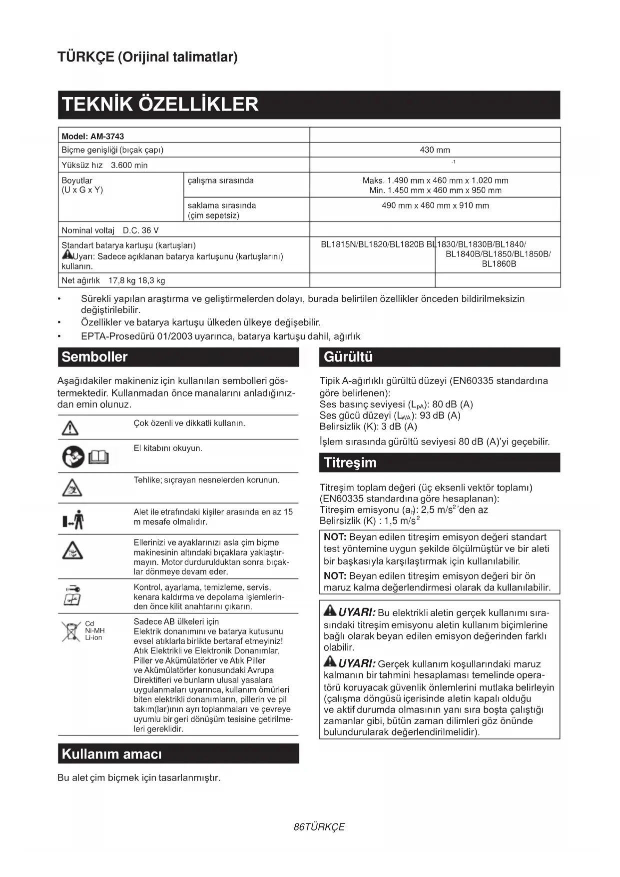 Boyutlar (UxGxY) çalışmasırasında Maks. 1.490 mm x 460 mm x 1.020 mm Min. 1.450 mm x 460 mm x 950 mm saklamasırasında (çim sepetsiz) 490 mm x 460 mm x 910 mm Nominalvoltaj D.C. 36 V Standartbataryakartuşu(kartuşları) Uyarı:Sadeceaçıklananbataryakartuşunu(kartuşlarını) kullanın. BL1815N/BL1820/BL1820B BL1830/BL1830B/BL1840/ BL1840B/BL1850/BL1850B/ BL1860B Netağırlık 17,8 kg 18,3 kg