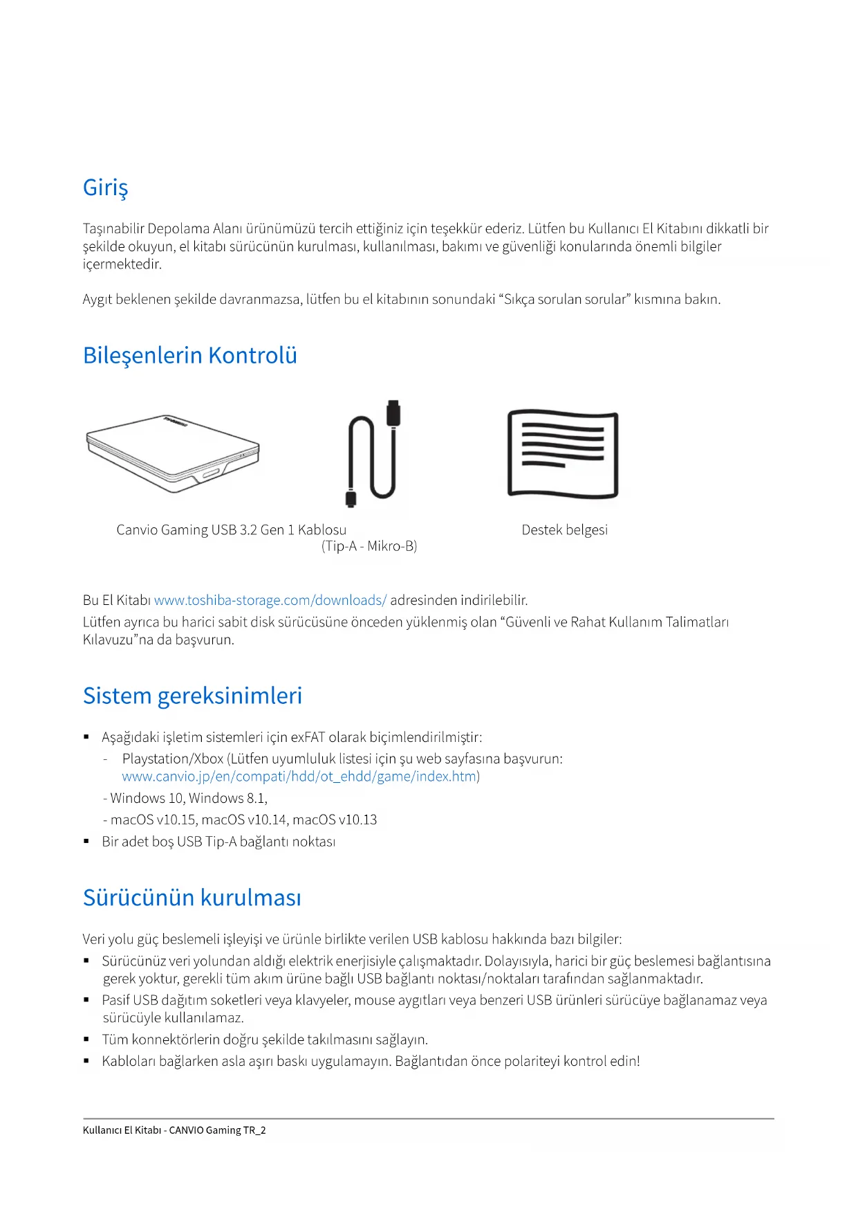 k sürücünün kablosunu çıkarabilirsiniz. < Mac > CTRL tuşunu basılı tutup sabit sürücü simgesini tıklayın ve “Çıkar”ı seçin. VEYA Sabit sürücü simgesini çöp kutusuna sürükleyin. Artık sürücünün kablosunu çıkarabilirsiniz.Kullanıcı El Kitabı - CANVIO Gaming TR_4 Sürücü kasasının / muhafazasının temizlenmesi Sürücüyü temizlemeden önce, sürücünün bilgisayarla bağlantısının fiziksel olarak kesilmiş olmasına dikkat edin. Temizlemek için standart ürünleri kullanmanızı ve yüzeyde kalacak muhtemel sıvıları mutlaka silmenizi tavsiye ediyoruz. Ek bilgilendirme Sürücünün yeniden adlandırılması, verilerin yedeklenmesi veya dosya yönetimi gibi olağan işleyiş durumları hakkında yapılması gereken ek işler için işletim sisteminizin kullanıcı kılavuzunu okumanızı tavsiye ediyoruz. Disk birleştirme ve en iyi duruma getirme gibi işler için de işletim sisteminin kullanıcı kılavuzunu okumanızı öneriyoruz. Verilerinizi virüs veya truva atı programlarının yol açacağı kasti hasardan korumak için bir anti-virüs yazılımını kurmanızı da tavsiye etmekteyiz. Sıkça sorulan sorular S: Windows için USB sürücüsüne ihtiyacım var mı? Y: Hayır, bunlar işletim sisteminizde zaten var. S: Sistemimi sürücüden başlatabilir miyim? Y: Hayır, çünkü Windows harici sabit disk sürücülerinden başlatmayı desteklemez. S: Sürücüye neden bir fan gerekmiyor? Y: Sürücüler optimum ısı dağıtımı sağlanacak şekilde tasarlanmıştır ve bu nedenle bir fana ihtiyaç duyulmamaktadır. Bu durum neredeyse sessiz bir çalışma imkanı sunmaktadır. S: Sürücümün kapasitesi (Windows içinde) neden söylenen gerçek kapasitesinden düşük gösteriliyor? Y: Bu farklılık kapasitenin farklı hesaplama yöntemleri kullanılarak gösterilmesinden kaynaklanmaktadır. Sabit disk sürücüsü üreticileri onluk sistemi kullanarak hesaplama yapar, işletim sistemi ise ikili sistemle hesaplama yapar. Örnek onlu: 1TB = 1,000GB 1GB = 1.000MB = 1.000.000KB = 1.000.000.000 bayt Örnek ikili: 1GB = 1.024MB = 1.048.576KB = 1.073.741.824 bayt Sonuç olarak, 1TB (onlu) bir sabit disk Windows’ta sadece 931GB (ikili) olarak gösterilir. S: Sürücümü bir bilgisayardan diğerine işletim sistemi kopyalamak için kullanabilir miyim? Y: Hayır, kurulum için işletim sistemi üreticisinin verdiği talimatları izlemeniz gereklidir. Basit bir kopyalama işlemi sonuç vermez.Kullanıcı El Kitabı - CANVIO Gaming TR_5 Sorun Giderme Bilgisayarım disk sürücüsünü tanımıyor. Tüm bağlantıların güvenli olmasına dikkat edin. Sürücünüz bir USB dağıtım soketi ile bağlanmışsa, bu soketin kendi güç beslemesi olmasına dikkat edin. Bir eklenti kartı kullanıyorsanız, kartın düzgün çalıştığından emin olun ve yazılımı/yerleşik yazılımı güncelleştirin. Sürücü çalışma sırasında sıcaksa bu durum tehlikeli midir? Y: Bu durum normaldir ve dolayısıyla tehlikeli değildir. Sürücü şu mesajı veriyor: “Aygıt başlatılamıyor.” Y: İki muhtemel neden söz konusudur. Ya bir güç sorunu vardır ve bağlantıları kontrol etmeniz gerekir ya da sürücü hatalı çalışmaktadır ve servise alınması gereklidir. Sürücüyü “Bilgisayarım/Bu bilgisayar” içinde göremiyorum ama Aygıt Yöneticisi içinde görünüyor. Y: Şu talimatları izleyin: