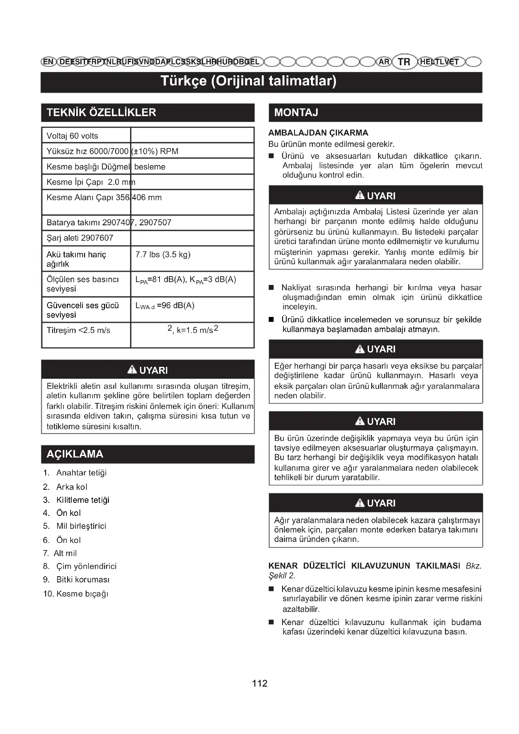 MONTAJ AMBALAJDAN ÇIKARMA Bu ürünün monte edilmesi gerekir. Ürünü ve aksesuarları kutudan dikkatlice çıkarın. Ambalaj listesinde yer alan tüm ögelerin mevcut olduğunu kontrol edin. UYARI Ambalajı açtığınızda Ambalaj Listesi üzerinde yer alan herhangi bir parçanın monte edilmiş halde olduğunu görürseniz bu ürünü kullanmayın. Bu listedeki parçalar üretici tarafından ürüne monte edilmemiştir ve kurulumu müşterinin yapması gerekir. Yanlış monte edilmiş bir ürünü kullanmak ağır yaralanmalara neden olabilir. Nakliyat sırasında herhangi bir kırılma veya hasar oluşmadığından emin olmak için ürünü dikkatlice inceleyin. Ürünü dikkatlice incelemeden ve sorunsuz bir şekilde kullanmaya başlamadan ambalajı atmayın. UYARI Eğer herhangi bir parça hasarlı veya eksikse bu parçalar değiştirilene kadar ürünü kullanmayın. Hasarlı veya eksik parçaları olan ürünü kullanmak ağır yaralanmalara neden olabilir. UYARI Bu ürün üzerinde değişiklik yapmaya veya bu ürün için tavsiye edilmeyen aksesuarlar oluşturmaya çalışmayın. Bu tarz herhangi bir değişiklik veya modikasyon hatalı kullanıma girer ve ağır yaralanmalara neden olabilecek tehlikeli bir durum yaratabilir. UYARI Ağır yaralanmalara neden olabilecek kazara çalıştırmayı önlemek için, parçaları monte ederken batarya takımını daima üründen çıkarın. KENAR DÜZELTİCİ KILAVUZUNUN TAKILMASI Bkz. Şekil 2. Kenar düzeltici kılavuzu kesme ipinin kesme mesafesini sınırlayabilir ve dönen kesme ipinin zarar verme riskini azaltabilir. Kenar düzeltici kılavuzunu kullanmak için budama kafası üzerindeki kenar düzeltici kılavuzuna basın. 112Türkçe (Orijinal talimatlar)