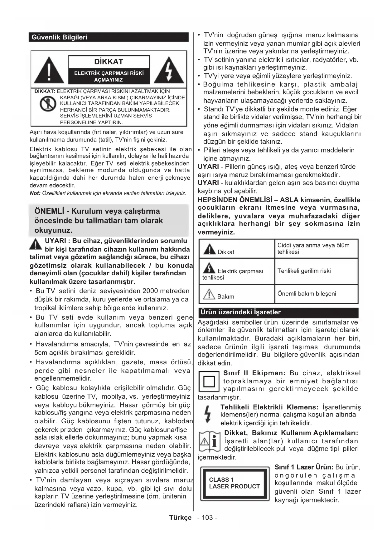 Dikkat, Bakınız Kullanım Açıklamaları: İşaretli alan(lar) kullanıcı tarafından değiştirilebilecek pul veya düğme tipi pilleri içermektedir. CLASS 1 LASER PRODUCT Sınıf 1 Lazer Ürün: Bu ürün, öngörülen çalışma koşullarında makul ölçüde güvenli olan Sınıf 1 lazer kaynağı içermektedir.Türkçe - 104 - UYARI Pili yutmayınız, Kimyasal Yanma tehlikesi Bu ürün veya birlikte verilen aksesuarlar bir pul/düğme tipi pil içerebilir. Eğer düğme tipi pil yutulursa, sadece 2 saat içerisinde vücudunuzun içinde ciddi yanmalara ve ölüme neden olabilir. Yeni ve kullanılmış pilleri çocuklardan uzak tutunuz. Eğer pil yuvası düzgün bir şekilde kapanmıyorsa, ürünü kullanmayınız ve çocuklardan uzak tutunuz. Eğer pillerin yutulduğunu veya vücudunuzda bulunduğunu düşünüyorsanız, derhal tıbbi destek alınız. – – – – – – – – – – – – Dikkat Denge Uyarısı Televizyon düşmesi durumunda ciddi yaralanmalara veya ölüme neden olabilir. Özellikle çocukların maruz olabileceği birçok yaralanma aşağıdakiler gibi basit tedbirler alınarak önlenebilir: