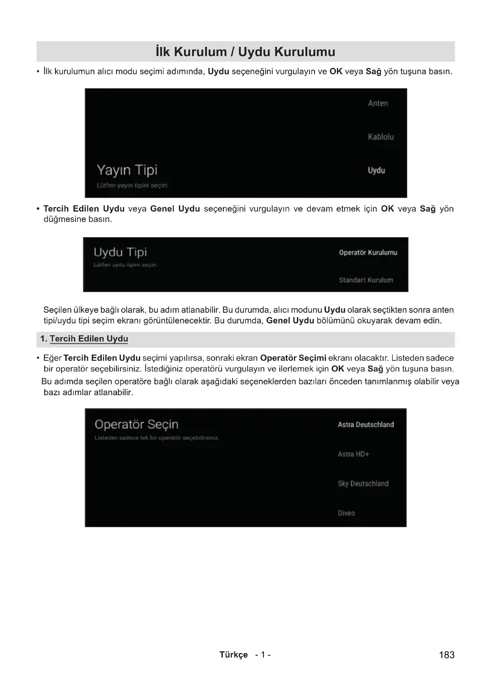 - Eğer Tercih Edilen Uydu seçimi yapılırsa, sonraki ekran Operatör Seçimi ekranı olacaktır. Listeden sadece bir operatör seçebilirsiniz. İstediğiniz operatörü vurgulayın ve ilerlemek için OK veya Sağ yön tuşuna basın. Bu adımda seçilen operatöre bağlı olarak aşağıdaki seçeneklerden bazıları önceden tanımlanmış olabilir veya bazı adımlar atlanabilir. 183Türkçe - 2 - 1.1. Anten Tipi - Doğrudan
