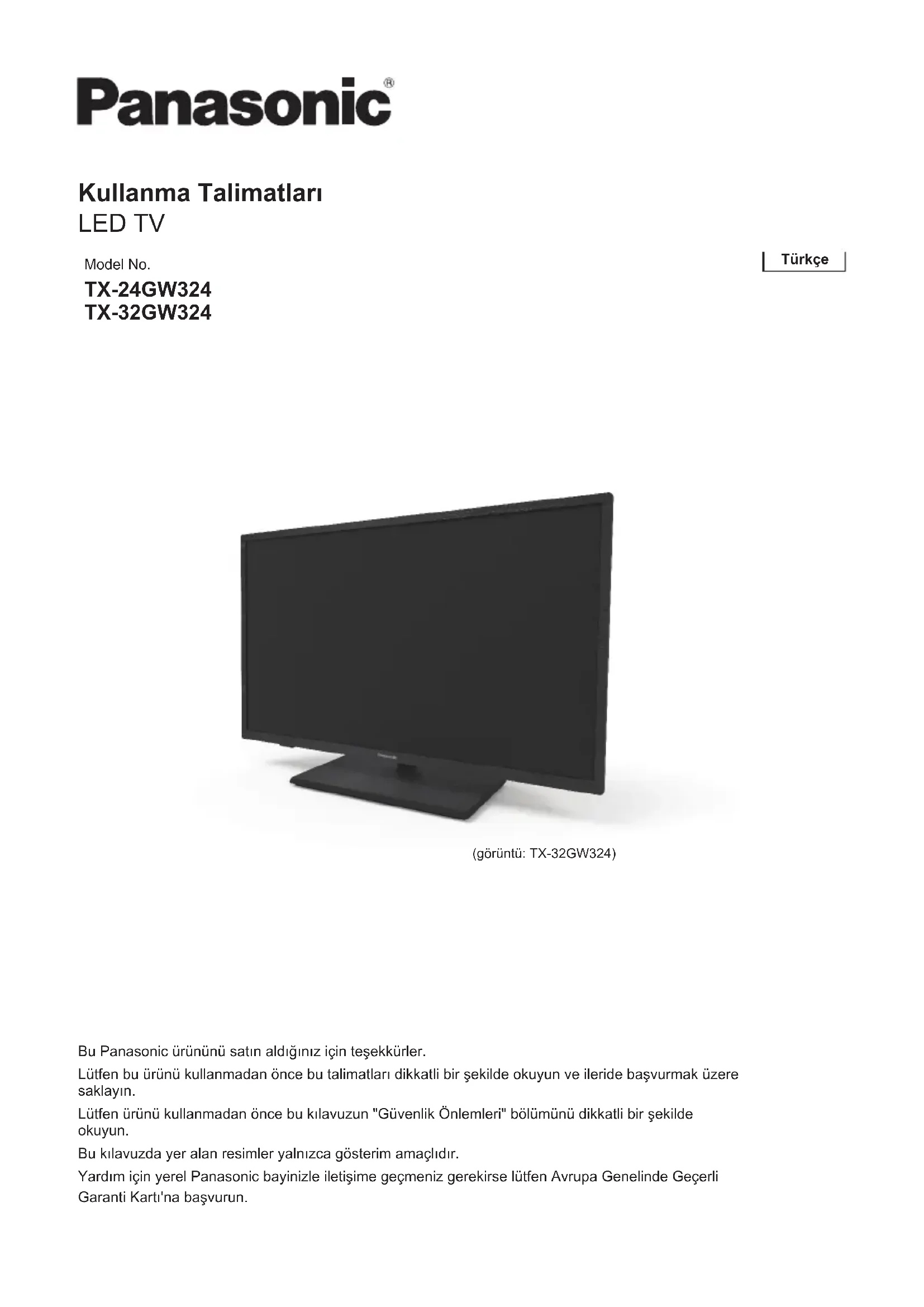 Yardım için lütfen yerel Panasonic bayinizle iletişime geçin. Bu TV'nin bulunmadığı bir yerden sorguda bulunursanız bu TV'nin kendisinde bulunan bağlantı, olay vb. durumların görsel onayını gerektiren içeriklerle ilgili olarak size yanıt veremeyiz.32 Türkçe Bakım Öncelikle, şebeke fişini şebeke prizinden çıkarın. Ekran paneli, Kabin, Kaide Normal bakım:Kir veya parmak izlerini çıkarmak için yumuşak bir bez kullanarak ekran paneli, kabin ya da kaidenin yüzeyini yavaşça silin.İnatçı kirler için:(1) İlk olarak yüzeydeki tozu temizleyin.(2) Yumuşak bir bezi temiz su veya seyreltilmiş nötr deterjanla (1 birim deterjana 100 birim su) nemlendirin.(3) Bezi iyice sıkın. (Lütfen sıvının TV içine girmemesine dikkat edin; aksi halde ürün arızalanabilir.)(4) İnatçı kiri dikkatli bir şekilde nemli bezle silip temizleyin.(5) Son olarak, nemin tamamını silerek giderin.Dikkat Sert bir bez kullanmayın veya yüzeyi çok sert bir şekilde ovmayın; aksi halde yüzeyde çiziklere neden olabilirsiniz. Yüzeylere böcek kovucu, çözelti, tiner veya diğer uçucu maddelerden sıkmamaya dikkat edin. Bu, yüzey kalitesini bozabilir veya boyanın soyulmasına neden olabilir. Ekran panelinin yüzeyi özel işlem görmüştür ve kolayca zarar görebilir. Yüzeye tırnağınız veya diğer sert nesnelerle dokunmamaya veya çizmemeye dikkat edin. Kabinin veya zeminin kauçuk ya da PVC malzemelerle uzun süre temas etmesine izin vermeyin. Aksi halde, yüzey kalitesi düşebilir. Şebeke fişi Şebeke fişini düzenli aralıklarla kuru bir bezle silin. Nem ve toz, yangına veya elektrik çarpmasına neden olabilir. Teknik özellikler ■ TV Model No. 24 inç modelTX-24GW32432 inç modelTX-32GW324 Boyutlar (E × B × Y) 24 inç model556 mm × 393 mm × 176 mm (Kaideyle)556 mm × 344 mm × 68 mm (yalnızca TV)32 inç model732 mm × 487 mm × 195 mm (Kaideyle)732 mm × 438 mm × 77 mm (yalnızca TV) Kütle 24 inç model3,36 kg Net (Kaideyle)3,09 kg Net (yalnızca TV)32 inç model4,91 kg Net (Kaideyle)4,41 kg Net (yalnızca TV) Güç kaynağı AC 220-240 V, 50/60 Hz Panel LED LCD panel Ses Hoparlör çıkışı24 inç model6 W (3 W + 3 W)32 inç model10 W (5 W + 5 W)Kulaklık3,5 mm stereo mini jak × 133 Türkçe Bağlantı terminalleri SCART (RGB/CVBS) SCART adaptörü HDMI 1/2 girişi TYPE A Konnektörleri HDMI 1: İçerik Türü, Ses Dönüş Kanalı, Derin Renk, x.v.Colour™ HDMI 2: İçerik Türü, Derin Renk, x.v.Colour™ Kart yuvası Ortak Arayüz yuvası (CI Plus ile uyumludur) × 1 USB DC 5 V, Maks. 500 mA [Yüksek Hızlı USB (USB 2.0)] DIGITAL AUDIO çıkışı PCM/Dolby Digital, Fiber optik Alım sistemleri/Bant adı DVB-C Dijital kablolu tv hizmetleri (MPEG2, MPEG4- AVC(H.264) ve MPEG HEVC) DVB-T/T2 Dijital karasal hizmetler (MPEG2, MPEG4- AVC(H.264) ve MPEG HEVC)