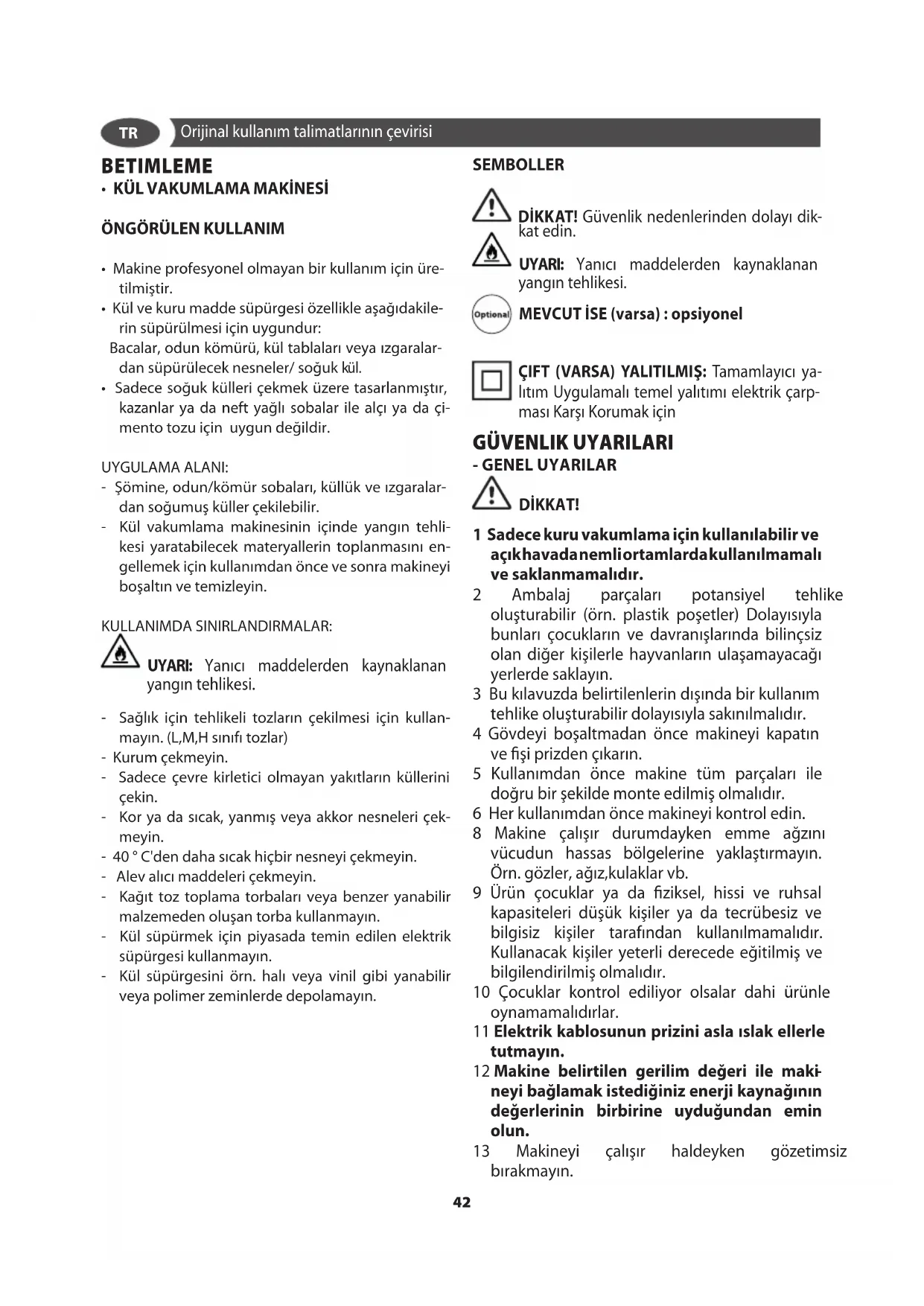 - Sadece soğuk külleri çekmek üzere tasarlanmıştır, kazanlar ya da neft yağlı sobalar ile alçı ya da çi- mento tozu için uygun değildir. UYGULAMA ALANI: - Şömine, odun/kömür sobaları, küllük ve ızgaralar- dan soğumuş küller çekilebilir. - Kül vakumlama makinesinin içinde yangın tehli- kesi yaratabilecek materyallerin toplanmasını en- gellemek için kullanımdan önce ve sonra makineyi boşaltın ve temizleyin. KULLANIMDA SINIRLANDIRMALAR: UYARI: Yanıcı maddelerden kaynaklanan yangın tehlikesi. - Sağlık için tehlikeli tozların çekilmesi için kullan- mayın. (L,M,H sınıfı tozlar) - Kurum çekmeyin. - Sadece çevre kirletici olmayan yakıtların küllerini çekin. - Kor ya da sıcak, yanmış veya akkor nesneleri çek- meyin. - 40 ° C'den daha sıcak hiçbir nesneyi çekmeyin. - Alev alıcı maddeleri çekmeyin. - Kağıt toz toplama torbaları veya benzer yanabilir malzemeden oluşan torba kullanmayın. - Kül süpürmek için piyasada temin edilen elektrik süpürgesi kullanmayın. - Kül süpürgesini örn. halı veya vinil gibi yanabilir veya polimer zeminlerde depolamayın.