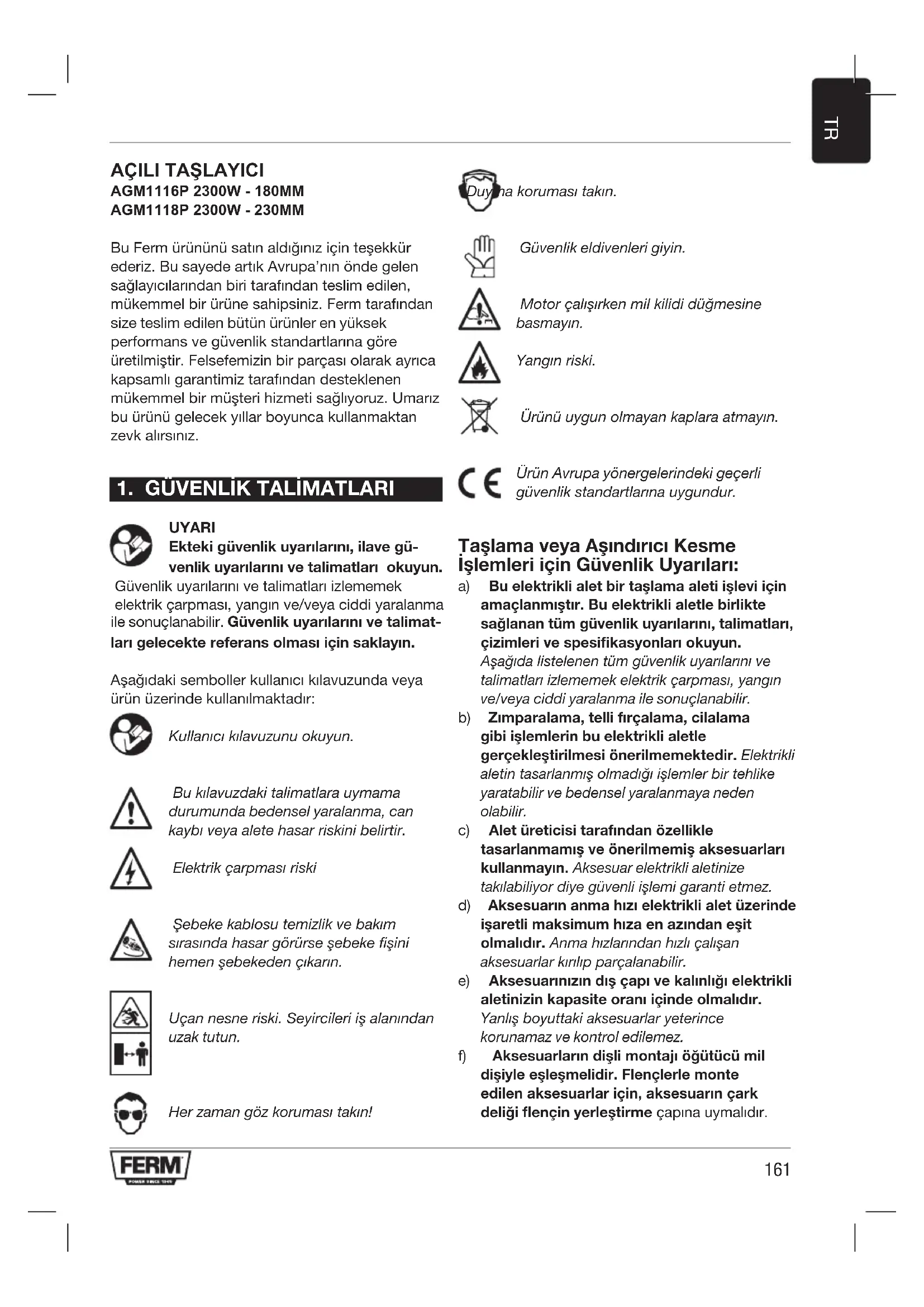 UYARI Ekteki güvenlik uyarılarını, ilave gü- venlik uyarılarını ve talimatları okuyun. Güvenlik uyarılarını ve talimatları izlememek elektrik çarpması, yangın ve/veya ciddi yaralanma ile sonuçlanabilir. Güvenlik uyarılarını ve talimat- ları gelecekte referans olması için saklayın. Aşağıdaki semboller kullanıcı kılavuzunda veya ürün üzerinde kullanılmaktadır: Kullanıcı kılavuzunu okuyun. Bu kılavuzdaki talimatlara uymama durumunda bedensel yaralanma, can kaybı veya alete hasar riskini belirtir. Elektrik çarpması riski Şebeke kablosu temizlik ve bakım sırasında hasar görürse şebeke fişini hemen şebekeden çıkarın. Uçan nesne riski. Seyircileri iş alanından uzak tutun. Her zaman göz koruması takın! Duyma koruması takın. Güvenlik eldivenleri giyin. Motor çalışırken mil kilidi düğmesine basmayın. Yangın riski. Ürünü uygun olmayan kaplara atmayın. Ürün Avrupa yönergelerindeki geçerli güvenlik standartlarına uygundur. Taşlama veya Aşındırıcı Kesme İşlemleri için Güvenlik Uyarıları: a) Bu elektrikli alet bir taşlama aleti işlevi için amaçlanmıştır. Bu elektrikli aletle birlikte sağlanan tüm güvenlik uyarılarını, talimatları, çizimleri ve spesikasyonları okuyun. Aşağıda listelenen tüm güvenlik uyarılarını ve talimatları izlememek elektrik çarpması, yangın ve/veya ciddi yaralanma ile sonuçlanabilir. b) Zımparalama, telli fırçalama, cilalama gibi işlemlerin bu elektrikli aletle gerçekleştirilmesi önerilmemektedir. Elektrikli aletin tasarlanmış olmadığı işlemler bir tehlike yaratabilir ve bedensel yaralanmaya neden olabilir. c) Alet üreticisi tarafından özellikle tasarlanmamış ve önerilmemiş aksesuarları kullanmayın. Aksesuar elektrikli aletinize takılabiliyor diye güvenli işlemi garanti etmez. d) Aksesuarın anma hızı elektrikli alet üzerinde işaretli maksimum hıza en azından eşit olmalıdır. Anma hızlarından hızlı çalışan aksesuarlar kırılıp parçalanabilir. e) Aksesuarınızın dış çapı ve kalınlığı elektrikli aletinizin kapasite oranı içinde olmalıdır. Yanlış boyuttaki aksesuarlar yeterince korunamaz ve kontrol edilemez. f) Aksesuarların dişli montajı öğütücü mil dişiyle eşleşmelidir. Flençlerle monte edilen aksesuarlar için, aksesuarın çark deliği ençin yerleştirme çapına uymalıdır.162