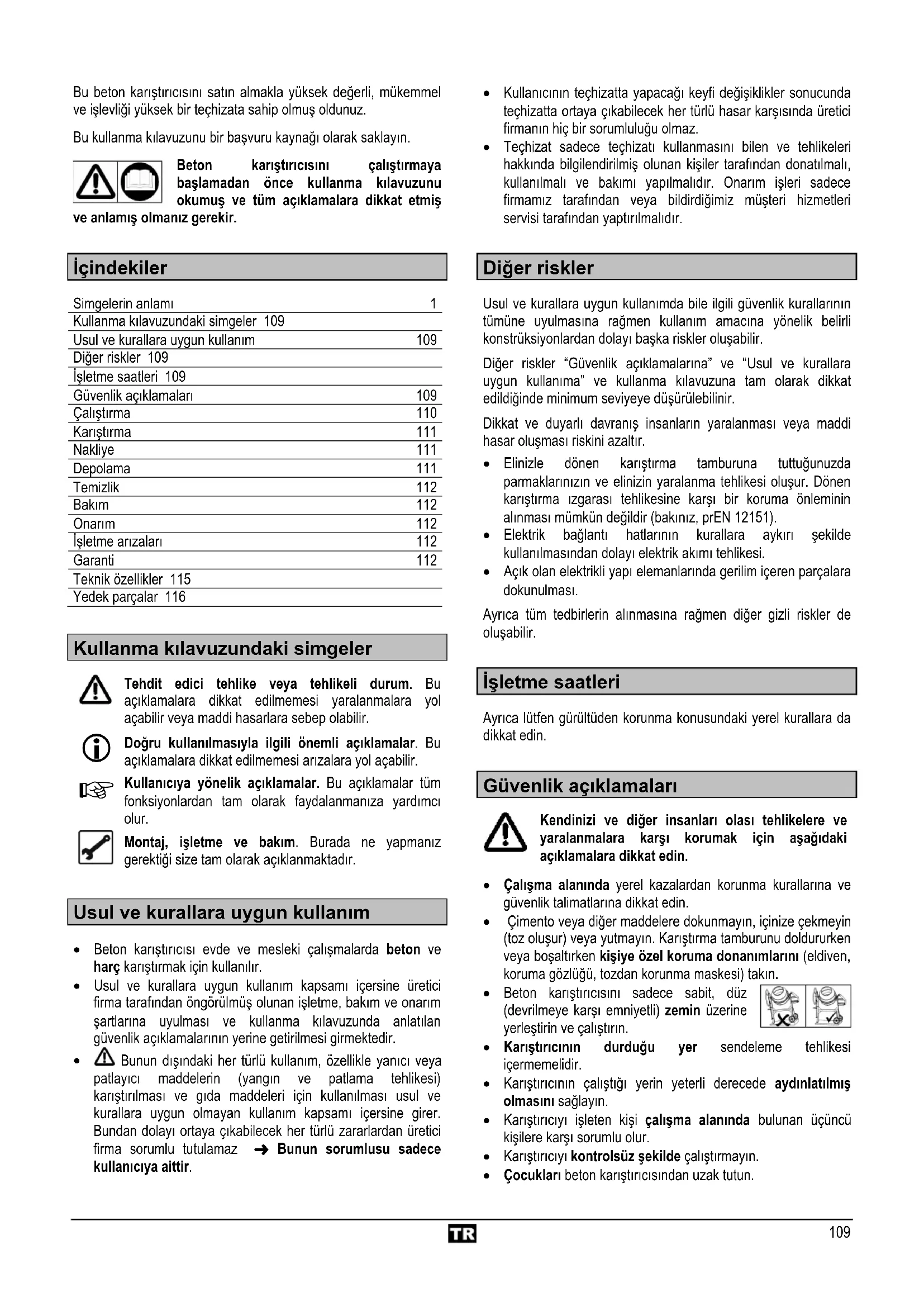 İçindekiler Diğer riskler Simgelerin anlamı 1 Usul ve kurallara uygun kullanımda bile ilgili güvenlik kurallarının tümüne uyulmasına rağmen kullanım amacına yönelik belirli konstrüksiyonlardan dolayı başka riskler oluşabilir. Kullanma kılavuzundaki simgeler 109 Usul ve kurallara uygun kullanım 109 Diğer riskler 109 Diğer riskler “Güvenlik açıklamalarına” ve “Usul ve kurallara uygun kullanıma” ve kullanma kılavuzuna tam olarak dikkat edildiğinde minimum seviyeye düşürülebilinir. İşletme saatleri 109 Güvenlik açıklamaları 109 Çalıştırma 110 Dikkat ve duyarlı davranış insanların yaralanması veya maddi hasar oluşması riskini azaltır. Karıştırma 111 Nakliye 111