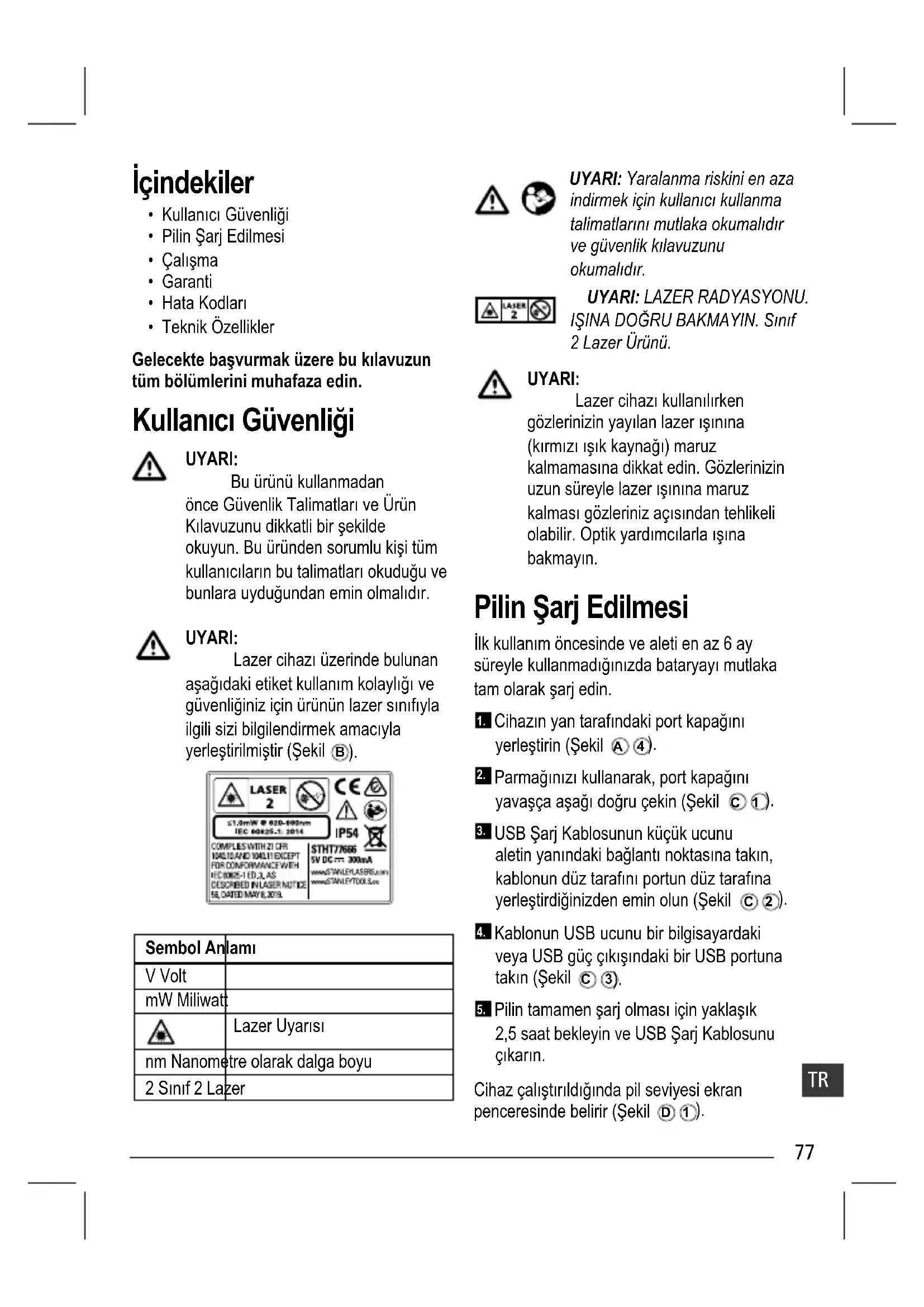 Sembol Anlamı V Volt mW Miliwatt Lazer Uyarısı nm Nanometre olarak dalga boyu 2 Sınıf 2 Lazer UYARI: Yaralanma riskini en aza indirmek için kullanıcı kullanma talimatlarını mutlaka okumalıdır ve güvenlik kılavuzunu okumalıdır. UYARI: LAZER RADYASYONU. IŞINA DOĞRU BAKMAYIN. Sınıf 2 Lazer Ürünü. UYARI: Lazer cihazı kullanılırken gözlerinizin yayılan lazer ışınına (kırmızı ışık kaynağı) maruz kalmamasına dikkat edin. Gözlerinizin uzun süreyle lazer ışınına maruz kalması gözleriniz açısından tehlikeli olabilir. Optik yardımcılarla ışına bakmayın. Pilin Şarj Edilmesi İlk kullanım öncesinde ve aleti en az 6 ay süreyle kullanmadığınızda bataryayı mutlaka tam olarak şarj edin.