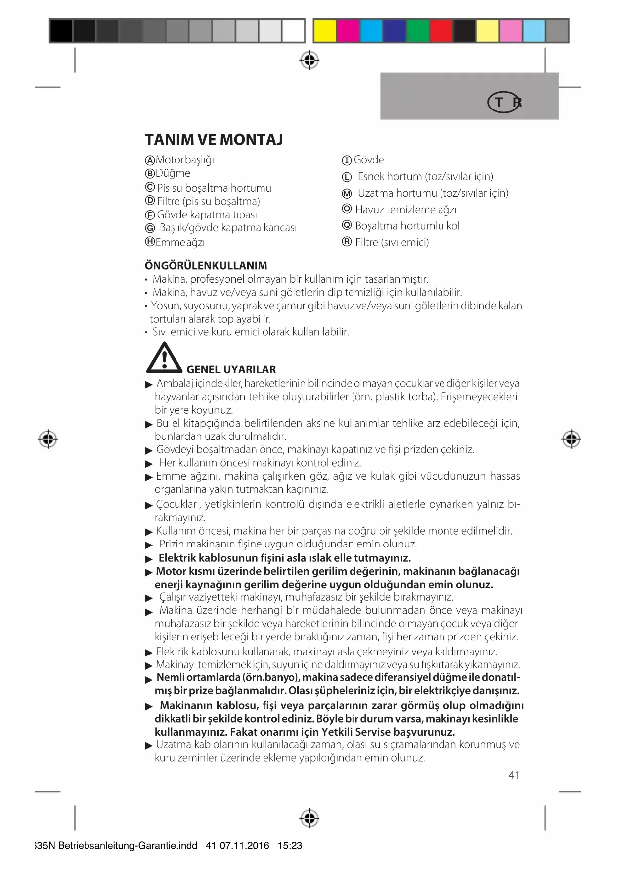 Ongorlen kullanima uygun filtrerleri monte etmeden asla calistirmayiniz.