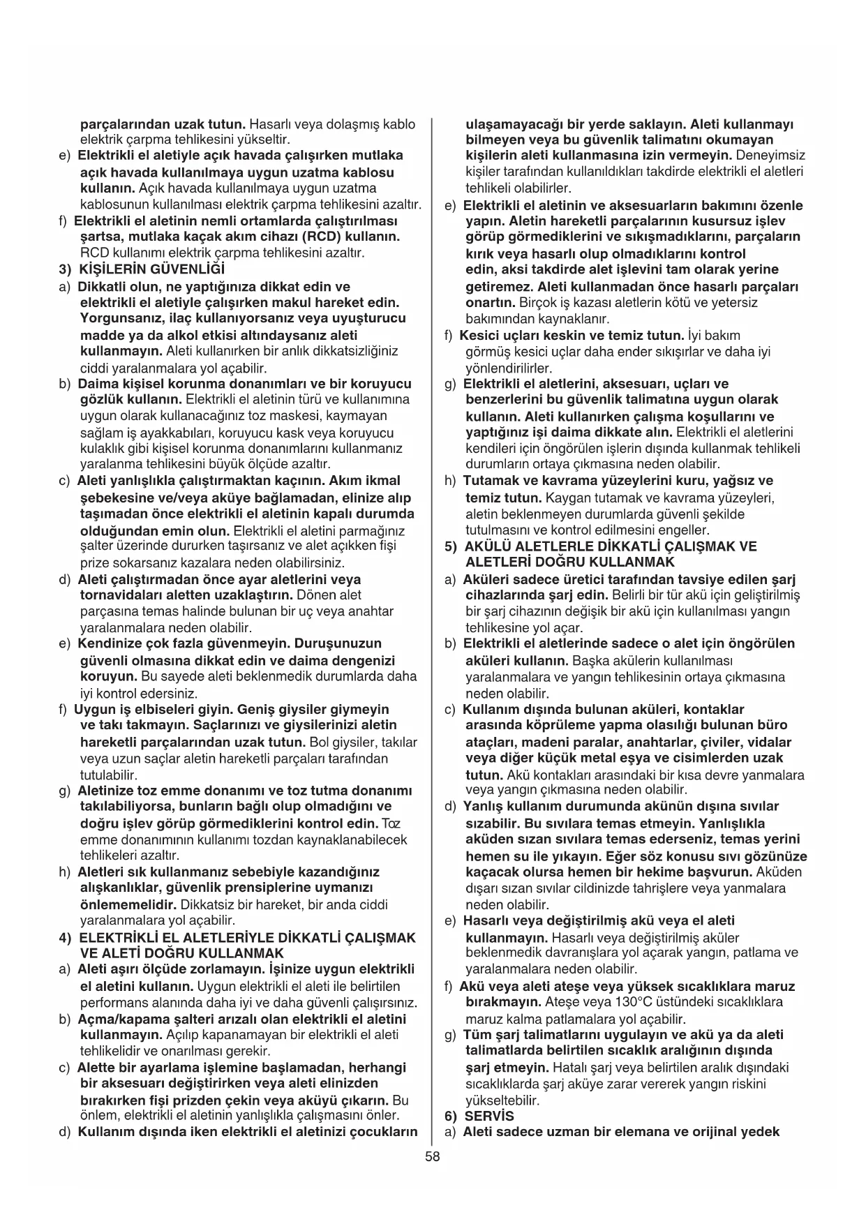 a) Aleti sadece uzman bir elemana ve orijinal yedek parçalarından uzak tutun. Hasarlı veya dolaşmış kablo elektrik çarpma tehlikesini yükseltir. e) Elektrikli el aletiyle açık havada çalışırken mutlaka açık havada kullanılmaya uygun uzatma kablosu kullanın. Açık havada kullanılmaya uygun uzatma kablosunun kullanılması elektrik çarpma tehlikesini azaltır. f) Elektrikli el aletinin nemli ortamlarda çalıştırılması şartsa, mutlaka kaçak akım cihazı (RCD) kullanın. RCD kullanımı elektrik çarpma tehlikesini azaltır.