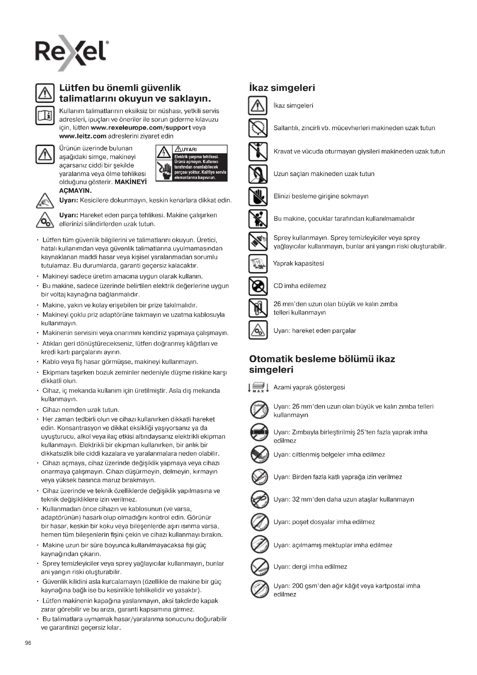 - Bu talimatlara uymamak hasar/yaralanma sonucunu doğurabilir ve garantinizi geçersiz kılar. Lütfen bu önemli güvenlik talimatlarını okuyun ve saklayın. Kullanım talimatlarının eksiksiz bir nüshası, yetkili servis adresleri, ipuçları ve öneriler ile sorun giderme kılavuzu için, lütfen www.rexeleurope.com/support veya www.leitz.com adreslerini ziyaret edin Sallantılı, zincirli vb. mücevherleri makineden uzak tutun Kravat ve vücuda oturmayan giysileri makineden uzak tutun İkaz simgeleri Uzun saçları makineden uzak tutun Elinizi besleme girişine sokmayın İkaz simgeleri Yaprak kapasitesi CD imha edilemez 26 mm’den uzun olan büyük ve kalın zımba telleri kullanmayın Uyarı: hareket eden parçalar Uyarı: Kesicilere dokunmayın, keskin kenarlara dikkat edin. Uyarı: Hareket eden parça tehlikesi. Makine çalışırken ellerinizi silindirlerden uzak tutun. Bu makine, çocuklar tarafından kullanılmamalıdır Sprey kullanmayın. Sprey temizleyiciler veya sprey yağlayıcılar kullanmayın, bunlar ani yangın riski oluşturabilir. Uyarı: 26 mm’den uzun olan büyük ve kalın zımba telleri kullanmayın Uyarı: ciltlenmiş belgeler imha edilmez Uyarı: Zımbayla birleştirilmiş 25’ten fazla yaprak imha edilmez Otomatik besleme bölümü ikaz simgeleri Uyarı: Birden fazla katlı yaprağa izin verilmez Uyarı: 32 mm’den daha uzun ataşlar kullanmayın Azami yaprak göstergesi Uyarı: dergi imha edilmez Uyarı: 200 gsm’den ağır kâğıt veya kartpostal imha edilmez Uyarı: poşet dosyalar imha edilmez Uyarı: açılmamış mektuplar imha edilmez979797 Ikon Tip Modeller Düğme/gösterge ve eylem Otomatik çalıştırma ve bekleme düğmesi (bir kez basın) Manuel ters yönde çalıştırma düğmesi (basılı tutun) Manuel ileri yönde çalıştırma düğmesi (basılı tutun) Hazır göstergesi Aşırı ısınma göstergesi (makinenin soğumasına izin verin) Aşırı yükleme göstergesi / Kâğıt sıkışması göstergesi (yaprak sayısını azaltın / sıkışmayı giderin) Çöp kutusu dolu göstergesi (kapağı açın ve kutuyu boşaltın; 45X - kesici kafayı kaldırın ve kutuyu boşaltın) Kapak açık veya kesici kafa çıkarıldı göstergesi (kapağı sıkıca kapatın veya kesici kafayı kutunun üzerine tekrar yerleştirin) Kâğıt yükleme kapağı kilitli göstergesi (4 haneli şifreyi girerek kilidi açın) Kâğıt yükleme kapağını kilitleme - güvenlik şifresi düğmesi 1 Kâğıt yükleme kapağını kilitleme - güvenlik şifresi düğmesi 2 Kâğıt yükleme kapağını kilitleme - güvenlik şifresi düğmesi 3 Kâğıt yükleme kapağını kilitleme - güvenlik şifresi düğmesi 4 Çalıştırma
