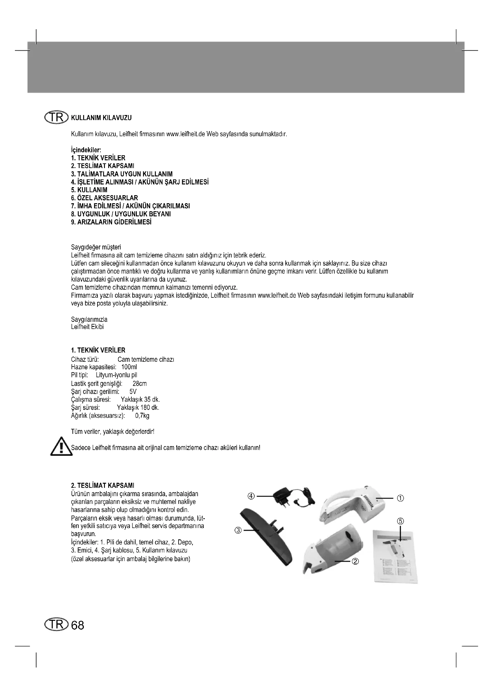 2.TESLİMATKAPSAMI Ürününambalajınıçıkarmasırasında,ambalajdan çıkarılanparçalarıneksiksizvemuhtemelnakliye hasarlarınasahipolupolmadığınıkontroledin. Parçalarıneksikveyahasarlıolmasıdurumunda,lüt- fenyetkilisatıcıyaveyaLeifheitservisdepartmanına başvurun. İçindekiler:1.Pilidedahil,temelcihaz,2.Depo, 3.Emici,4.Şarjkablosu,5.Kullanımkılavuzu (özelaksesuarlariçinambalajbilgilerinebakın)