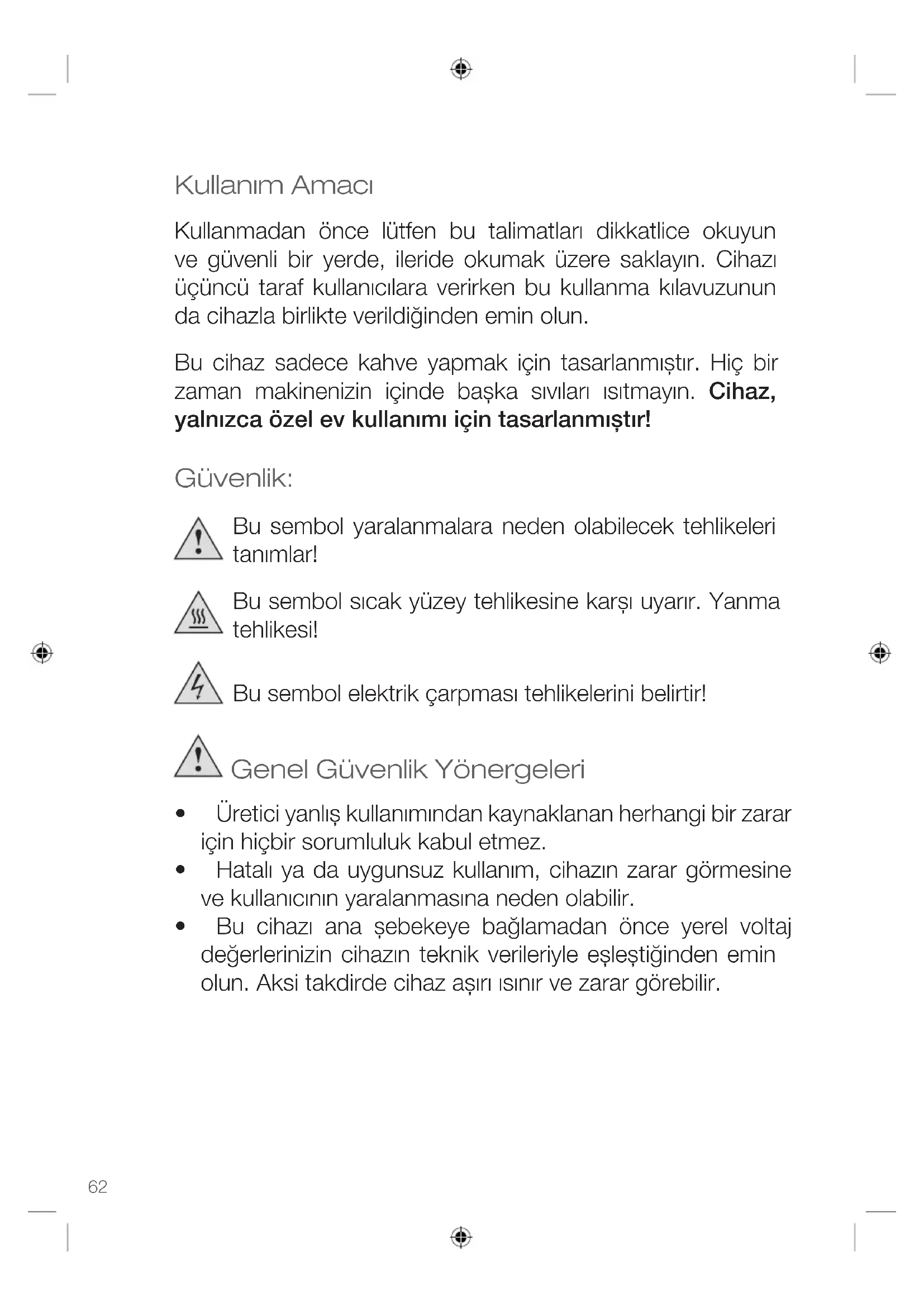 - por daños causados por el propietario. Esta garantía no afecta su derecho estatutario, ni ningún derecho legal que pueda tener como cliente bajo la legislación nacional aplicable que rija la compra de bienes. Para hacer valer su derecho de garantía durante el periodo garantizado, el cliente debe proporcionar una evidencia de la fecha de compra (recibo). La garantía debe presentarse contra KORONA electric GmbH, Sundern/Alemania. Línea telefónica directa: +49 2933 90284-80 Correo electrónico: service@korona-electric.de Página web: www.korona-electric.de dentro de los 2 años posteriores a la fecha de compra. En caso de hacer valer la garantía, el cliente tiene derecho a tener su aparato reparado en nuestra tienda o en una tienda autorizada. No se otorgan más derechos (por la garantía) al consumidor.62 Kullanım Amacı Kullanmadan önce lütfen bu talimatları dikkatlice okuyun ve güvenli bir yerde, ileride okumak üzere saklayın. Cihazı üçüncü taraf kullanıcılara verirken bu kullanma kılavuzunun da cihazla birlikte verildiğinden emin olun. Bu cihaz sadece kahve yapmak için tasarlanmıștır. Hiç bir zaman makinenizin içinde bașka sıvıları ısıtmayın. Cihaz, yalnızca özel ev kullanımı için tasarlanmıștır! Güvenlik: Bu sembol yaralanmalara neden olabilecek tehlikeleri tanımlar! Bu sembol sıcak yüzey tehlikesine karșı uyarır. Yanma tehlikesi! Bu sembol elektrik çarpması tehlikelerini belirtir! Genel Güvenlik Yönergeleri