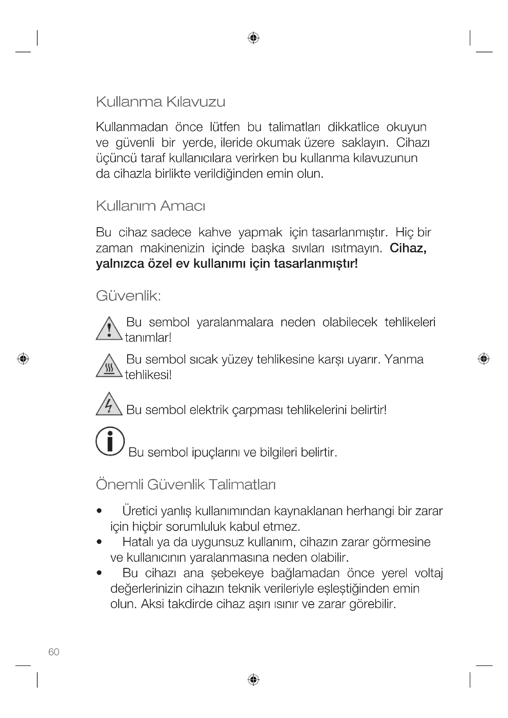 - pordañoscausadosporelpropietario. Esta garantía no afecta su derecho estatutario, ni ningún derecho legal que pueda tener como cliente bajo la legislación nacional aplicable que rija la compra de bienes. Para hacer valer su derecho de garantía durante el periodo garantizado, el cliente debe proporcionar una evidencia de lafechadecompra(recibo). La garantía debe presentarse contra KORONA electric GmbH, Sundern/Alemania. Línea telefónica directa: +49 2933 90284-80 Correo electrónico: service@korona-electric.de Página web: www.korona-electric.de dentro de los 2 años posteriores a la fecha de compra. En caso de hacer valer la garantía, el cliente tiene derecho a tener su aparato reparado en nuestra tienda o en una tienda autorizada.Noseotorganmásderechos(porlagarantía)al consumidor.60 Kullanma Kılavuzu Kullanmadan önce lütfen bu talimatları dikkatlice okuyun ve güvenli bir yerde, ileride okumak üzere saklayın. Cihazı üçüncü taraf kullanıcılara verirken bu kullanma kılavuzunun da cihazla birlikte verildiğinden emin olun. Kullanım Amacı Bu cihaz sadece kahve yapmak için tasarlanmıștır. Hiç bir zaman makinenizin içinde bașka sıvıları ısıtmayın. Cihaz, yalnızca özel ev kullanımı için tasarlanmıştır! Güvenlik: Bu sembol yaralanmalara neden olabilecek tehlikeleri tanımlar! Bu sembol sıcak yüzey tehlikesine karșı uyarır. Yanma tehlikesi! Bu sembol elektrik çarpması tehlikelerini belirtir! Bu sembol ipuçlarını ve bilgileri belirtir. Önemli Güvenlik Talimatları