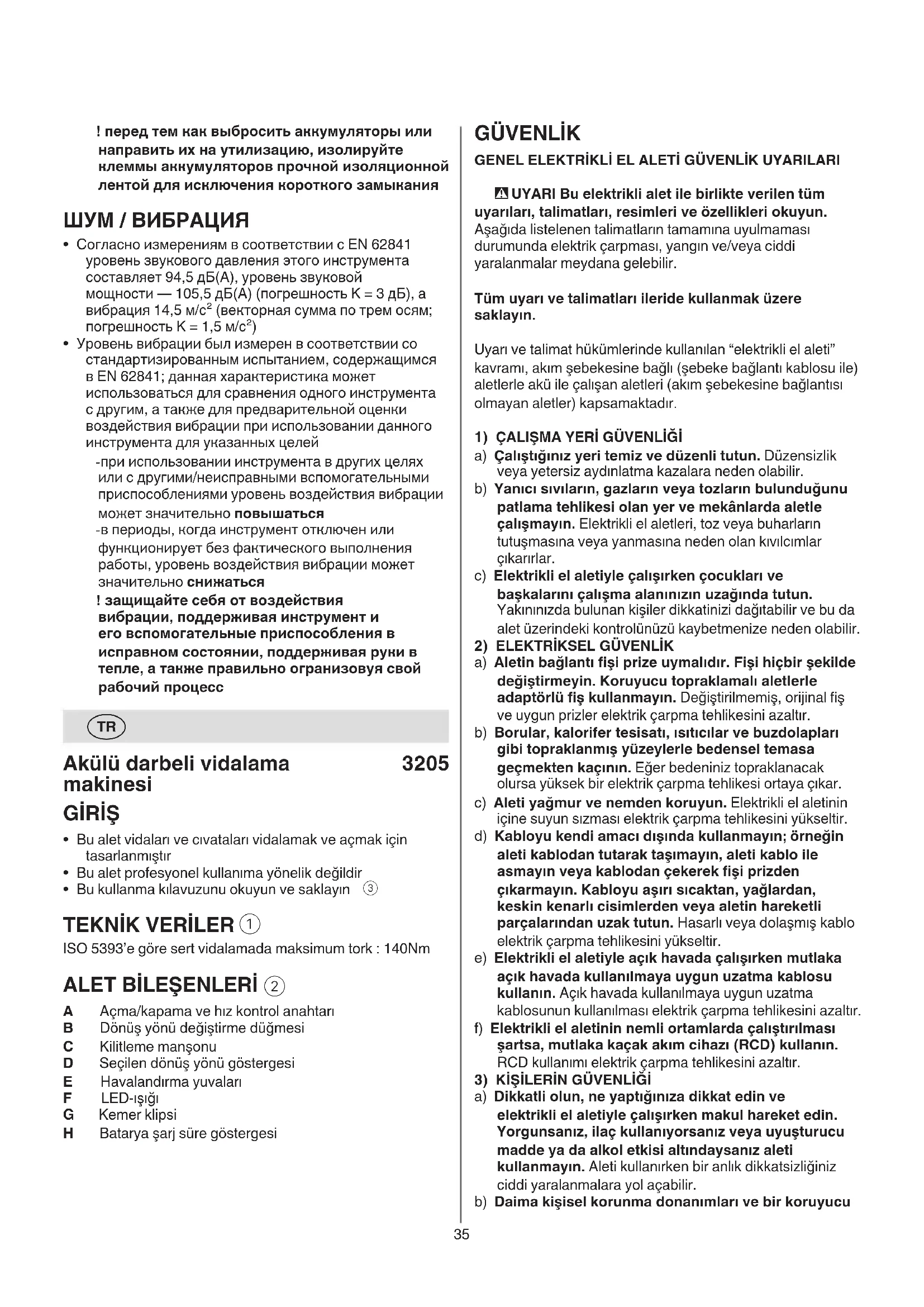 - EN 62841 uyarinca ölcülen bu aletin ses basinci seviyesi 94,5 dB(A) ve ses Güncü seviyesi 105,5 dB(A) (tolerans K = 3 dB), titresimi ise 14,5 m/s² (triaks vektör toplami; tolerans K = 1,5 m/s²)