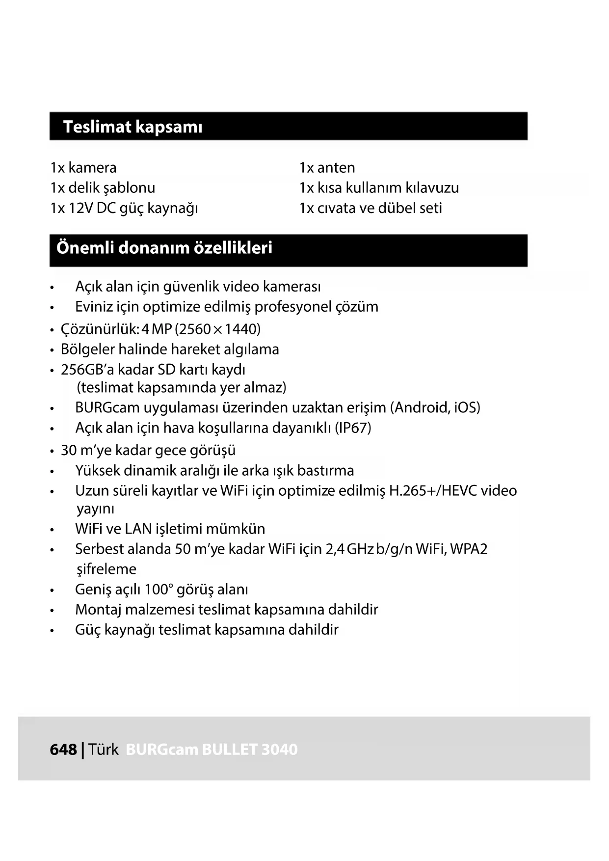 Menü maddeleri ile ilgili ayrıntılı bilgiyi kullanıcı kitapçığında bulabilirsiniz. Kamera tipi Açık ve kapalı alan için WiFi IR Bullet kamera Sensör 1/3” 4 MP Progressive Scan CMOS Çözünürlük 4 MP: 2560 x 1440 1080 p: 1920 x 1080 (= Full HD) 720 p: 1280 x 720 D1: 704 x 576 / 704 x 480 CIF: 352 x 288 / 352 x 240 Teknik Veriler666 | Türk BURGcam BULLET 3040 BURGcam BULLET 3040 Türk | 667 Kare hızı 20 fps @ 4 MP, 25 / 30 fps @ 1080 p IR LED 30 m kapsama alanına kadar* IR kesme filtresi Mekanik Objektif 2,8 mm F2.0 sabit objektif Görüş açısı Yatay: 100° Beyaz dengesi Otomatik WiFi IEEE802.11b / g / n; 50 m’ye kadar (serbest alan) LAN (RJ-45) 10 / 100 Base-T Desteklenen protokoller IPv4 / IPv6, HTTP, HTTPS, TCP / IP, UDP, UPnP, RTSP, RTP, SMTP, NTP, DHCP, DNS, DDNS, FTP, IP filtresi Micro-SD kartı maks. 256 GB; kayıtlar ve anlık görüntüler için Kurulum Duvara veya tavana montaj için tutucular dahil Gerilim beslemesi 12 V DC güç kaynağı teslimat kapsamına dahildir. Güç çekişi < 4,8 W Sıcaklık aralığı -30 °C ilâ +50 °C668 | Türk BURGcam BULLET 3040 Koruma sınıfı IP67 Ölçüler Ø 70 x 165 mm Ağırlık 0,45 kg Ek fonksiyonlar: Karşı ışık dengeleme BLC / HLC / WDR Parazit azaltma 3D Özel bölgeler 4 Hareket algılama bölgeleri