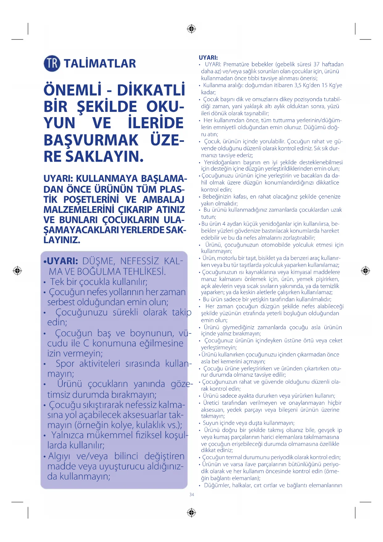 Cocuk, urunun icinde yorulabilir. Cocugun rahat ve givende oldugunu duzenli olarak kontrl ediniz. Sik sik durmanizi tavsiye ederiz; - Yenidoganlarin basinin en iyi sekilde desteklenebilmesi icin destegin iine duzgun ylerstirildiklerinden emin olun;
