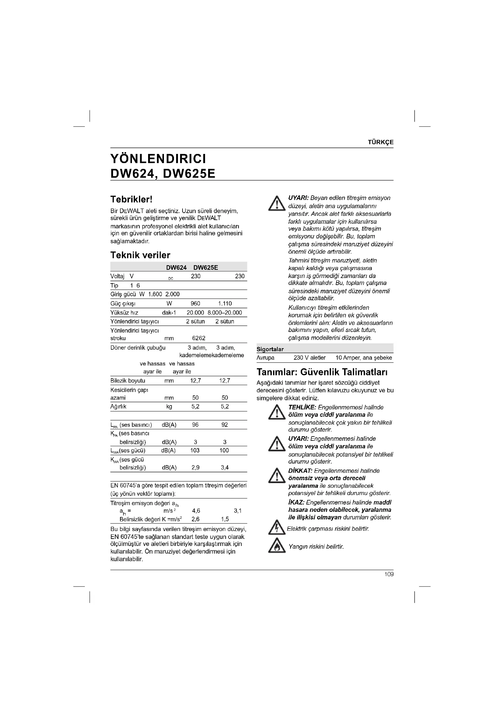 DW624, DW625E DEWALT, “teknik veriler” bölümünde açıklanan bu ürünlerin 2006/42/EC, EN 60745-1 ve EN 60745- 2-17 normlarına uygun olarak tasarlandığını beyan eder. Bu ürünler ayrıca 2004/108/EC Direktifi ile uyumludur. Daha fazla bilgi için, lütfen aşağıdaki adresten DEWALT ile irtibata geçin veya kılavuzun arkasına bakın. Bu belge altında imzası bulunan yetkili, teknik dosyanın derlenmesinden sorumludur ve bu beyanı DEWALT adına vermiştir. Horst Grossmann Başkan Yardımcısı, Mühendislik ve Ürün Geliştirme DEWALT, Richard-Klinger-Straße 11, D-65510, Idstein, Almanya
