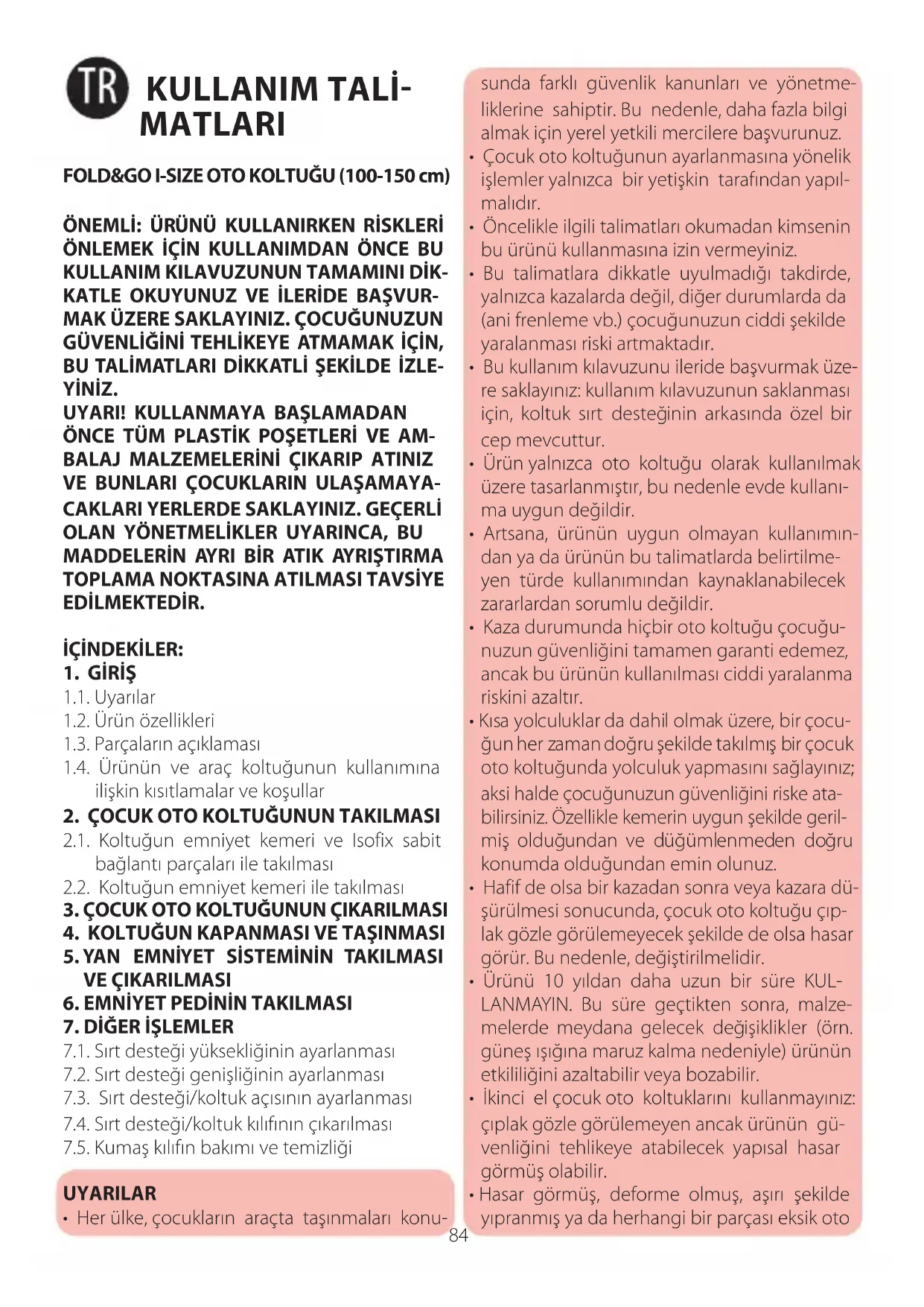 1.1. Uyarılar 1.2. Ürün özellikleri 1.3. Parçaların açıklaması 1.4. Ürünün ve araç koltuğunun kullanımına ilişkin kısıtlamalar ve koşullar