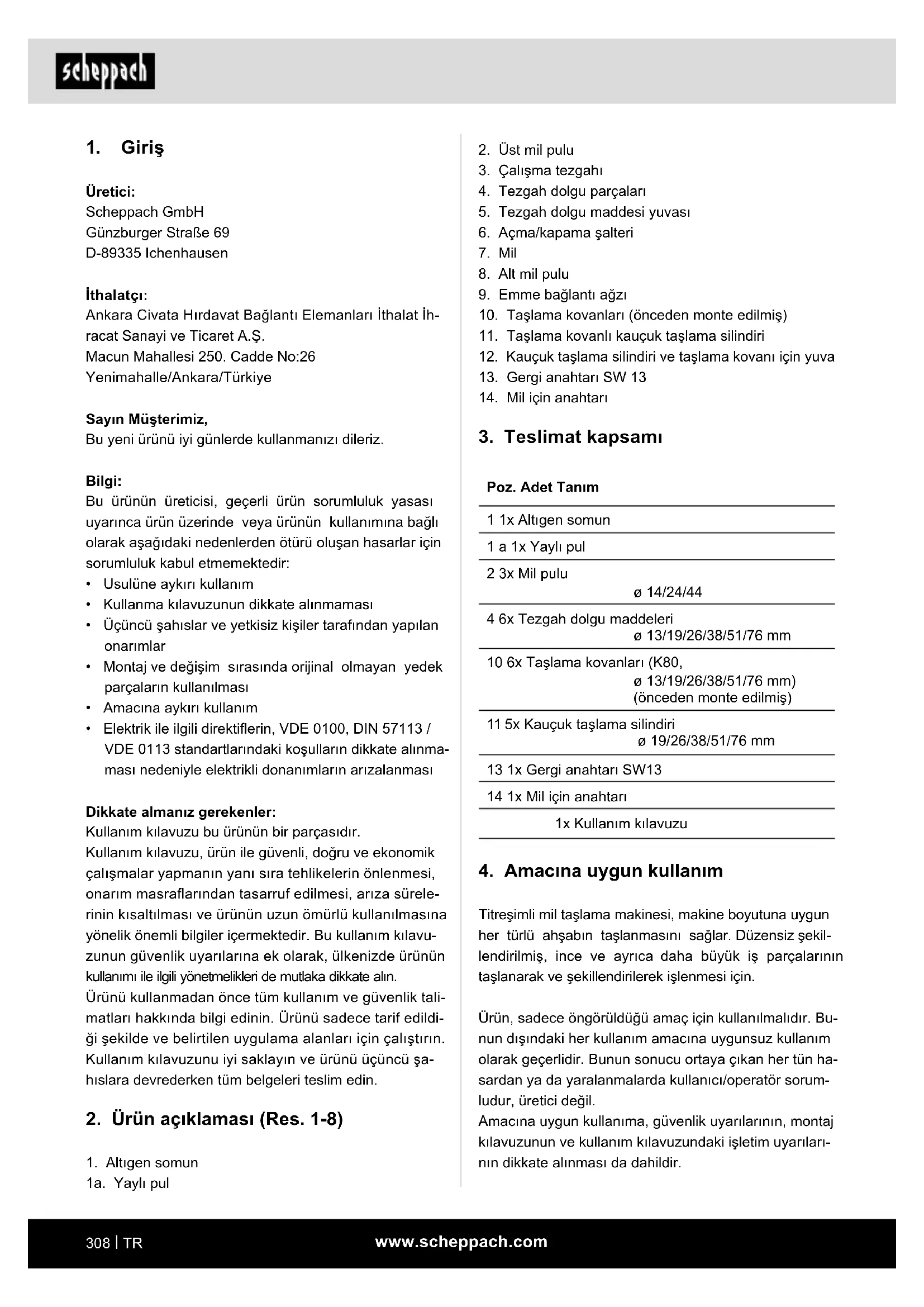 - Siparişlerinizde her zaman ürün numarasını ile ciha- zın tip ve yapım yılınız belirtin. m DİKKAT! Makine ve ambalaj malzemesi, çocuklar için uygun değildir! Çocuklar; plastik torbalar, folyolar ve kü- çük parçalar ile oynamamalıdır! Yutma ve boğulma tehlikesi söz konusudur!www.scheppach.com