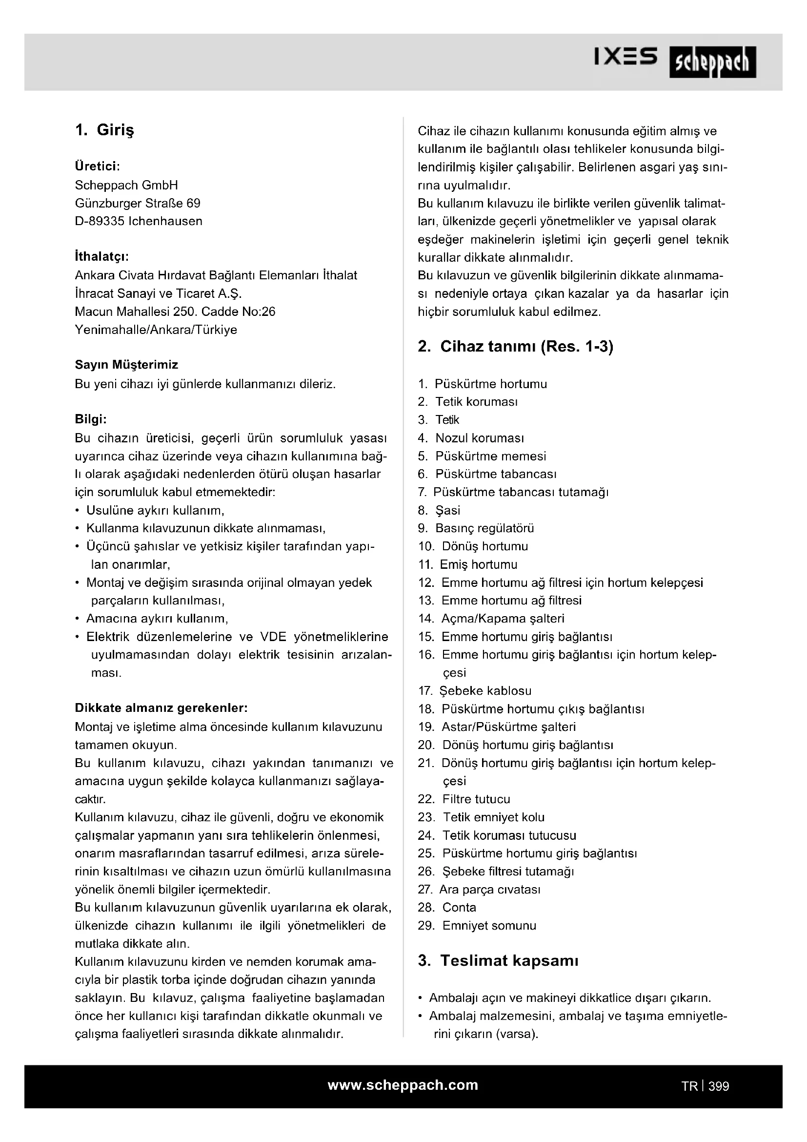 Üretici: Scheppach GmbH Günzburger Straße 69 D-89335 Ichenhausen Ithalatçı: Ankara Civata Hırdavat Bağlantı Elemanları İthalat İhracat Sanayi ve Ticaret A.Ş. Macun Mahallesi 250. Cadde No:26 Yenimahalle/Ankara/Türkiye Sayın Müşterimiz Bu yeni cihazı iyi günlerde kullanmanızı dileriz. Bilgi: Bu cihazın üreticisi, geçerli ürün sorumluluk yasası uyarınca cihaz üzerinde veya cihazın kullanımına bağ- lı olarak aşağıdaki nedenlerden ötürü oluşan hasarlar için sorumluluk kabul etmemektedir: