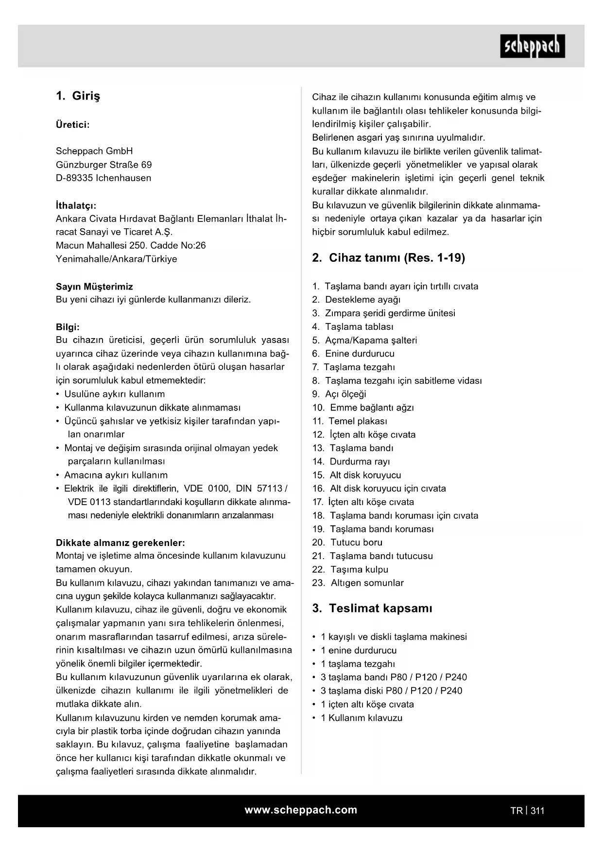 - Elektrik ile ilgili direktierin, VDE 0100, DIN 57113 / VDE 0113 standartlarındaki koşulların dikkate alınma- ması nedeniyle elektrikli donanımların arızalanması Dikkate almanız gerekenler: Montaj ve işletime alma öncesinde kullanım kılavuzunu tamamen okuyun. Bu kullanım kılavuzu, cihazı yakından tanımanızı ve ama- cına uygun şekilde kolayca kullanmanızı sağlayacaktır. Kullanım kılavuzu, cihaz ile güvenli, doğru ve ekonomik çalışmalar yapmanın yanı sıra tehlikelerin önlenmesi, onarım masraarından tasarruf edilmesi, arıza sürele- rinin kısaltılması ve cihazın uzun ömürlü kullanılmasına yönelik önemli bilgiler içermektedir. Bu kullanım kılavuzunun güvenlik uyarılarına ek olarak, ülkenizde cihazın kullanımı ile ilgili yönetmelikleri de mutlaka dikkate alın. Kullanım kılavuzunu kirden ve nemden korumak ama- cıyla bir plastik torba içinde doğrudan cihazın yanında saklayın. Bu kılavuz, çalışma faaliyetine başlamadan önce her kullanıcı kişi tarafından dikkatle okunmalı ve çalışma faaliyetleri sırasında dikkate alınmalıdır.www.scheppach.com
