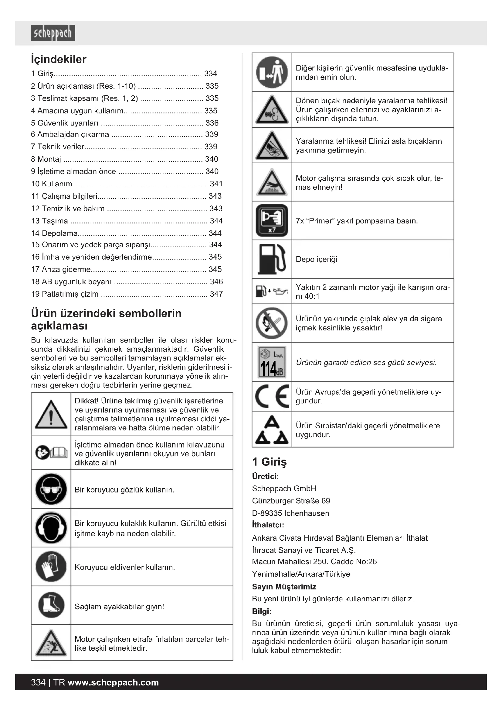 Ürünün garanti edilen ses gücü seviyesi. Ürün Avrupa'da geçerli yönetmeliklere uy- gundur. Ürün Sırbistan'daki geçerli yönetmeliklere uygundur. 1 Giriş Üretici: Scheppach GmbH Günzburger Straße 69 D-89335 Ichenhausen İthalatçı: Ankara Civata Hırdavat Bağlantı Elemanları İthalat İhracat Sanayi ve Ticaret A.Ş. Macun Mahallesi 250. Cadde No:26 Yenimahalle/Ankara/Türkiye Sayın Müşterimiz Bu yeni ürünü iyi günlerde kullanmanızı dileriz. Bilgi: Bu ürünün üreticisi, geçerli ürün sorumluluk yasası uya- rınca ürün üzerinde veya ürünün kullanımına bağlı olarak aşağıdaki nedenlerden ötürü oluşan hasarlar için sorum- luluk kabul etmemektedir: 334 | TR www.scheppach.com• Usulüne aykırı kullanım