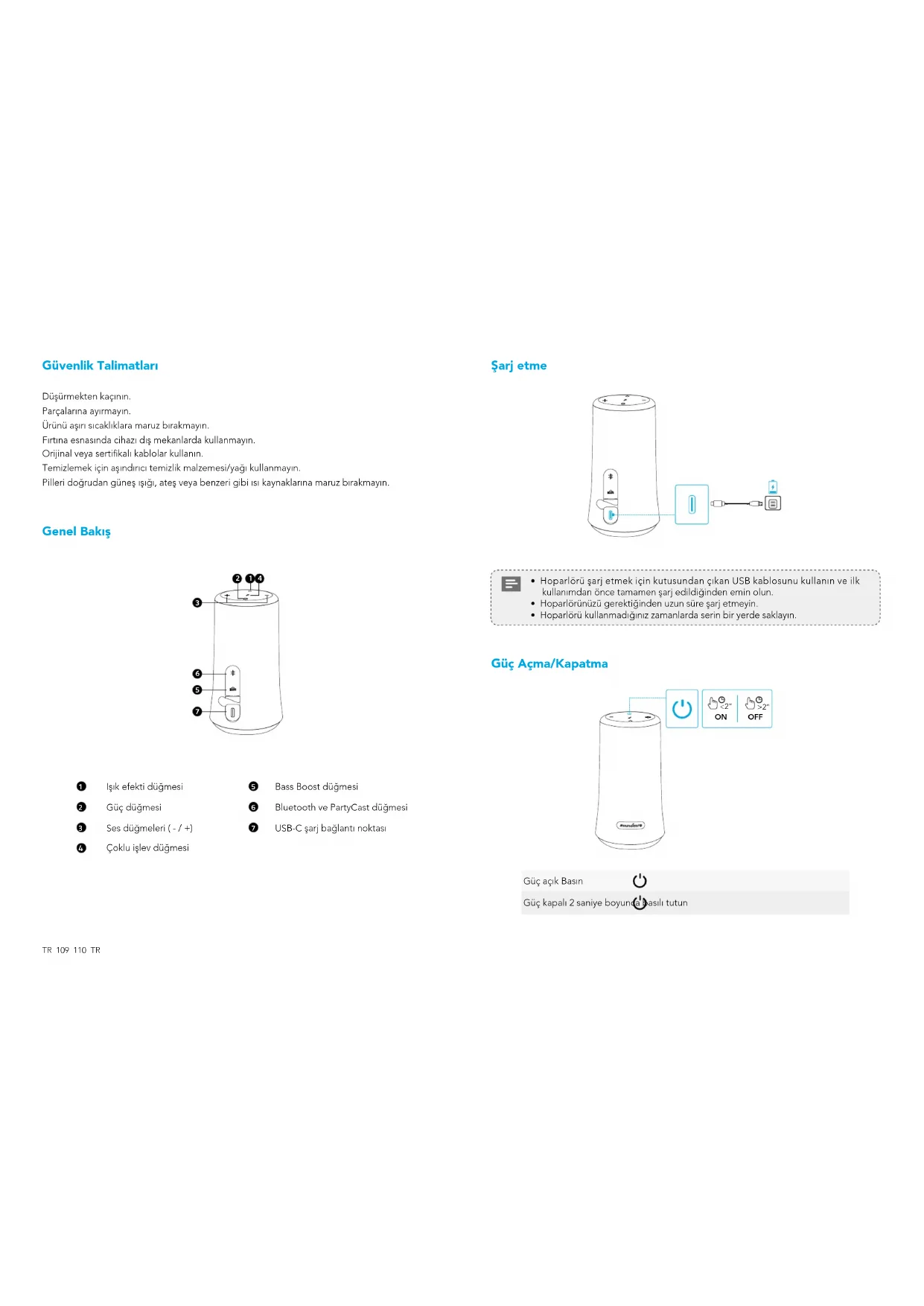 - Hoparlörü şarj etmek için kutusundan çıkan USB kablosunu kullanın ve ilk kullanımdan önce tamamen şarj edildiğinden emin olun.